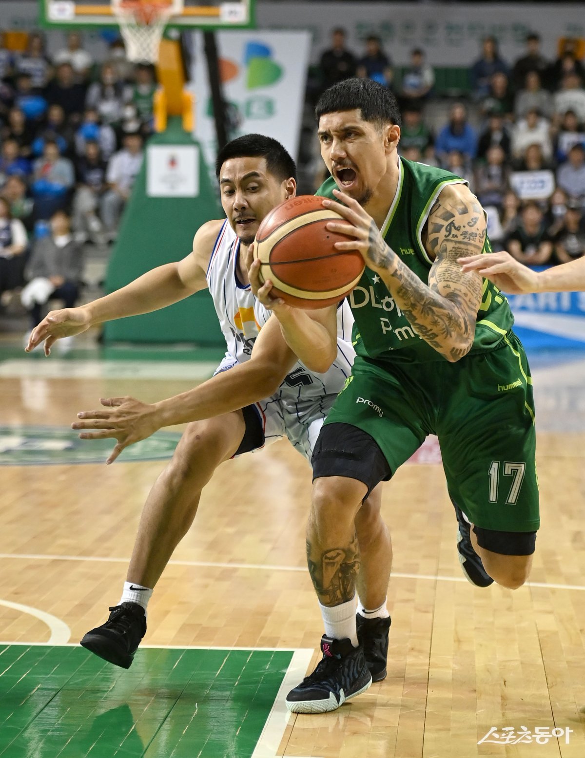 17일 원주종합체육관에서 열린 ‘2023-2024 프로농구’ 4강 플레이오프 2차전 DB와 KCC 경기에서 DB 알바노가 KCC 에피스톨라의 수비를 뚫고 골밑을 공격하고 있다.