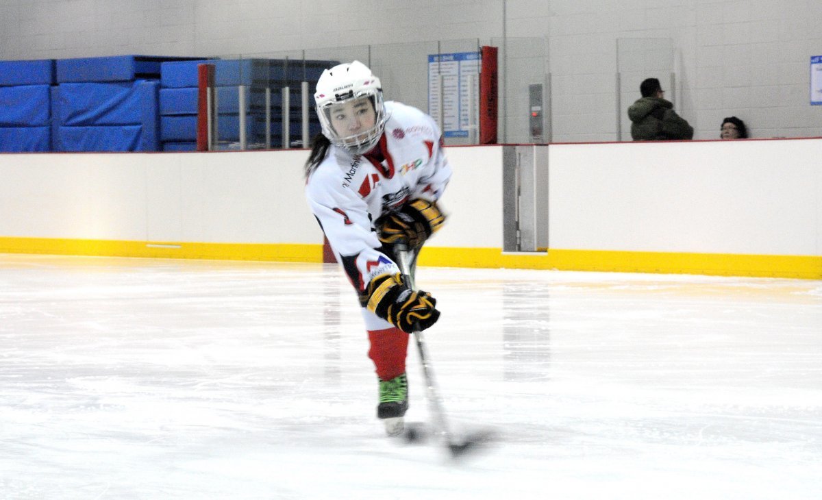 아이스하키 링크에서 연습 중 스틱을 들고 포즈를 취한 박지혜. 세계적인 바이올리니스트이자 스타트업 경영인으로 클래식의 미래를 위해