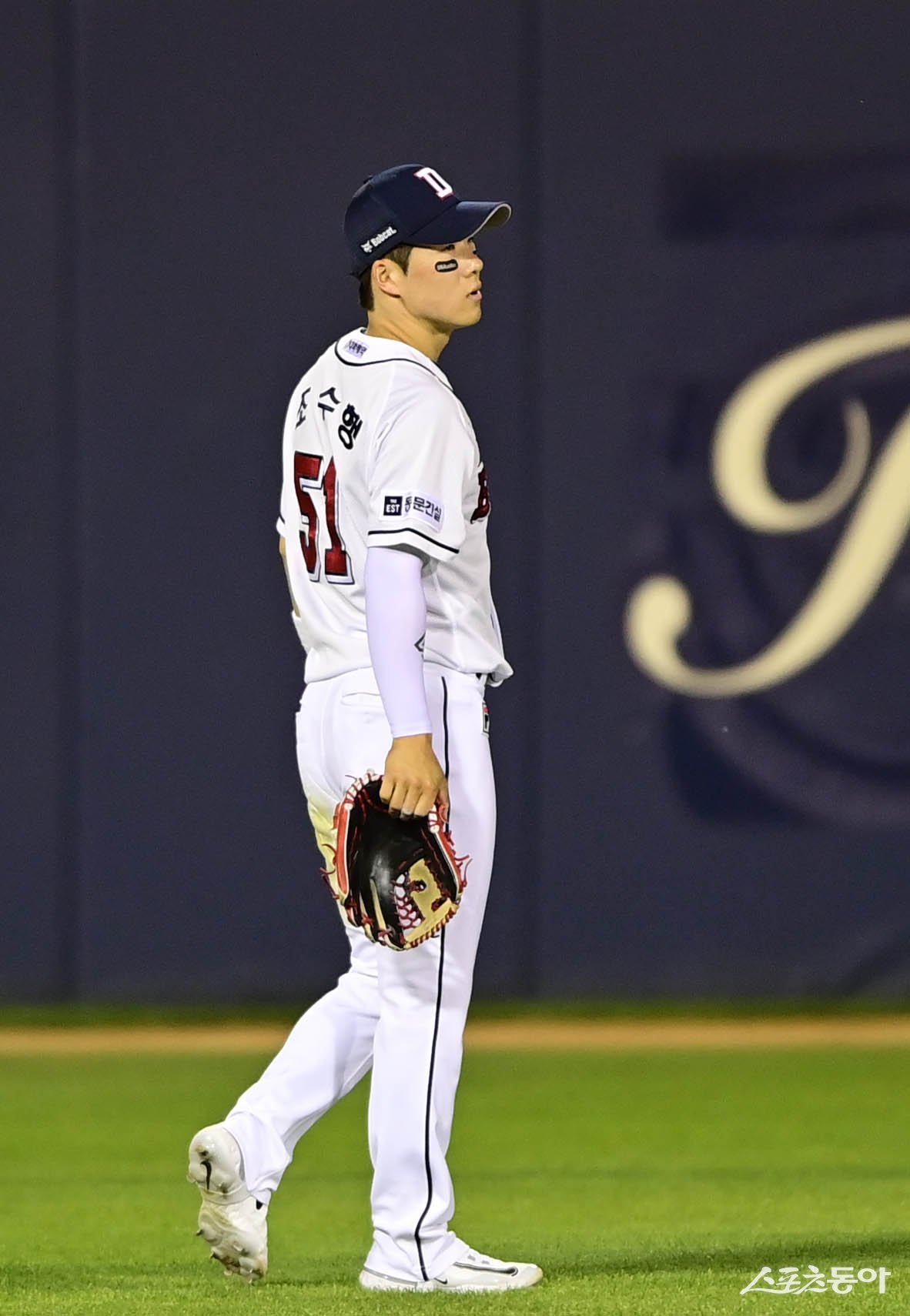 1일 서울 잠실야구장에서 열린 ‘2024 신한 SOL 뱅크 KBO리그’ 두산 베어스와 삼성 라이온즈의 경기에서 7회초 1사 1, 3루 삼성의 안타 때 볼을 놓친 두산 조수행이 아쉬워하고 있다.