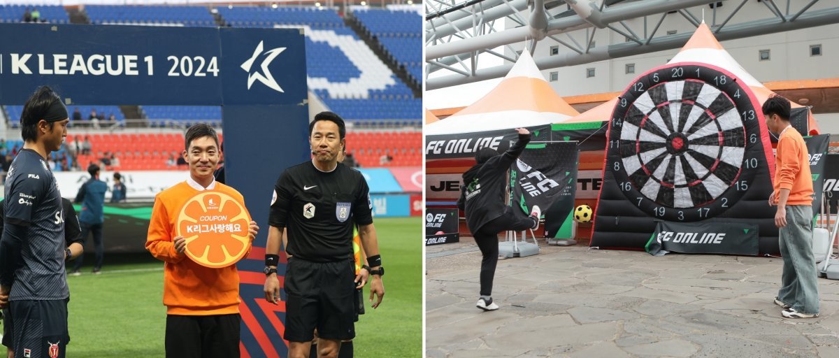 1일 제주월드컵경기장에서 열린 제주유나이티드FC와 광주FC의 K리그1 2024 10라운드 경기에선 특별한 이벤트가 눈길을 끌었다. 경기에 앞서 양팀의 공격 방향, 선축 우선권을 정하는 코인 토스 진행자로 박정무 넥슨 FC그룹장이 경기장에 등장했다. 코인은 제주도 특산물인 귤을 모티브로 특별 제작했으며, ‘K리그사랑해요’라는 게임 쿠폰도 삽입해 재미를 더했다. 제주 방문 10대 이용자 대상 행사도