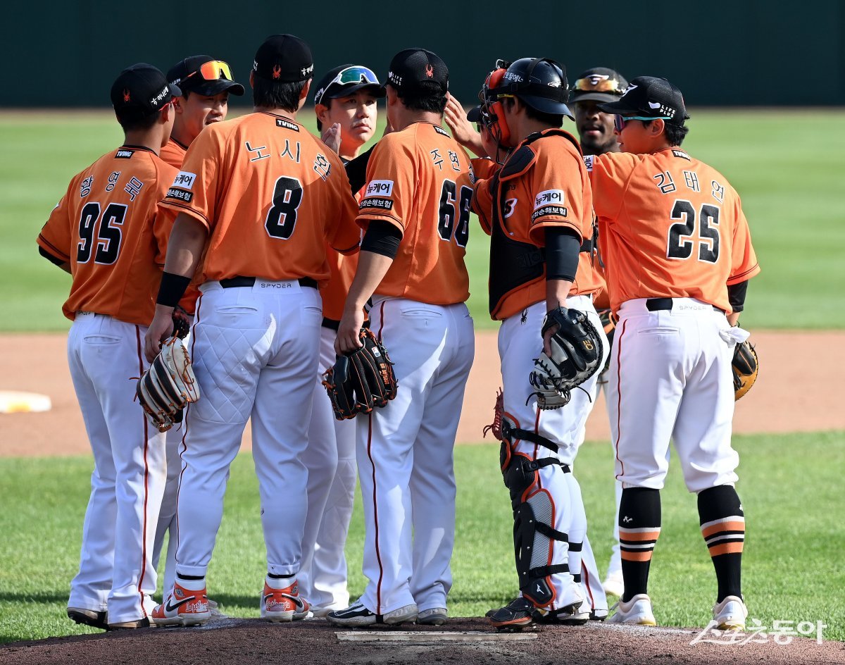 12일 한화생명 이글스파크에서 ‘2024 신한 SOL 뱅크 KBO리그’ 한화 이글스와 키움 히어로즈의 경기가 열렸다. 한화가 키움을 상대로 8-3 승리를 거둔 후 선수들이 그라운드에서 기쁨을 나누고 있다.
