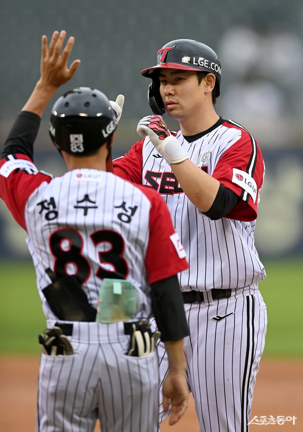 26일 서울 잠실야구장에서 ‘2024 신한은행 SOL뱅크 KBO리그’ NC 다이노스와 LG 트윈스 경기가 열렸다. 4회말 무사 LG 홍창기가 우전 안타를 치고 1루에서 기뻐하고 있다.
