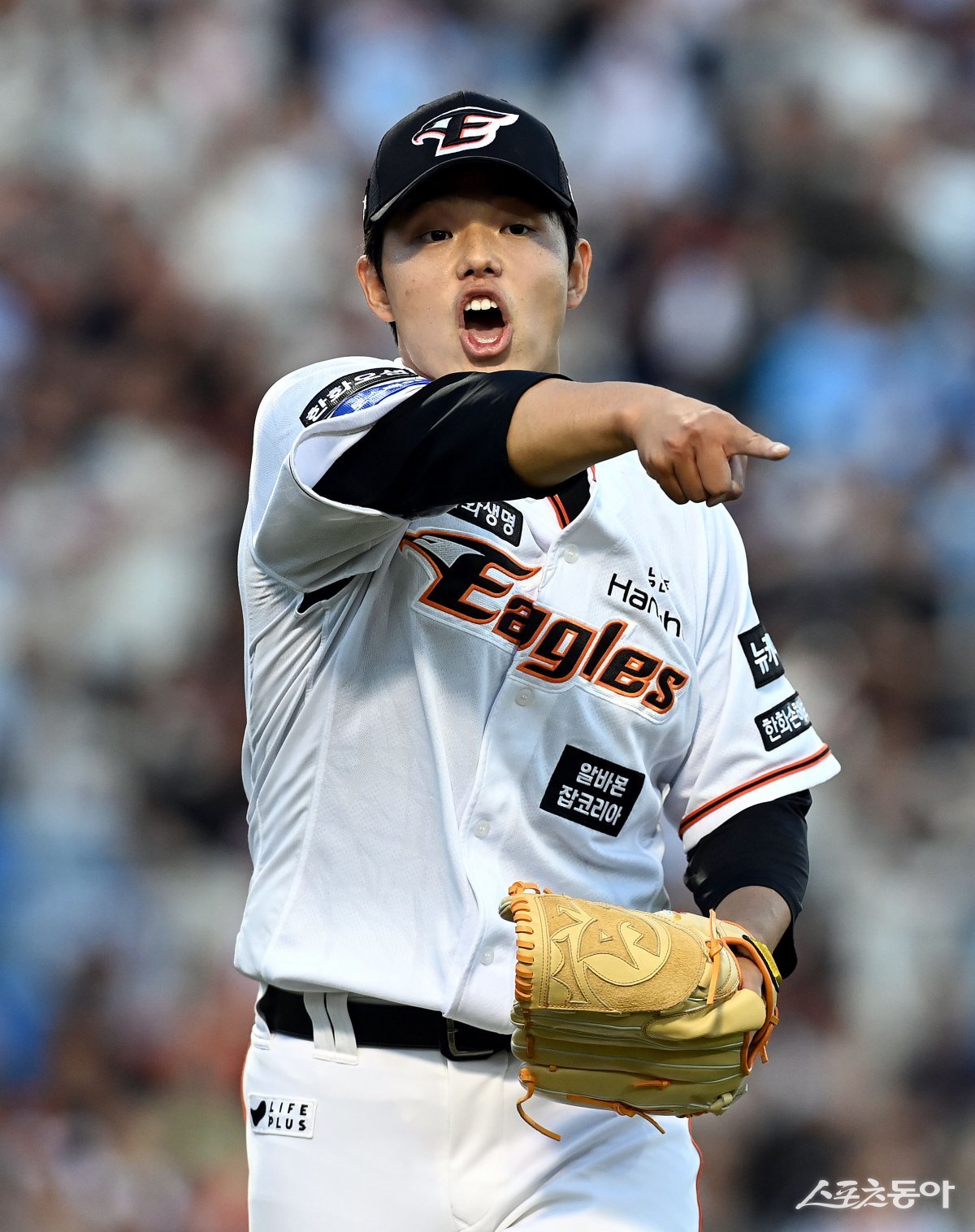 28일 대전 한화생명이글스파크에서 ‘2024 신한 SOL 뱅크 KBO리그’ 한화 이글스와 롯데 자이언츠의 경기가 열렸다. 3회초 1사 1, 3루에서 내야땅볼 때 병살 상황에서 한화 선발 문동주가 손짓하고 있다.