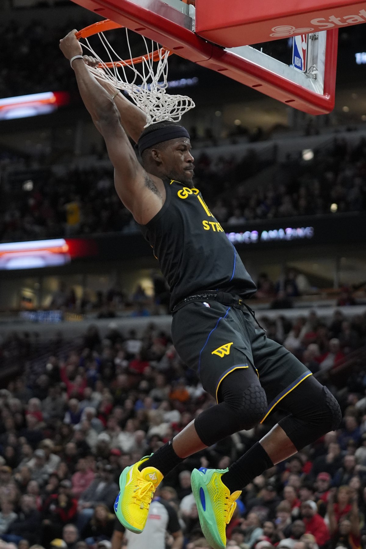 골든스테이트의 지미 버틀러가 9일(한국시간) 유나이티드센터에서 열린 시카고와 원정경기에서 투핸드 덩크슛을 터트리고 있다. 골든스테이드는 스테판 커리와 버틀러를 앞세워 시카고에 역전승을 거뒀다. 시카고(미 일리노이주)|AP뉴시스