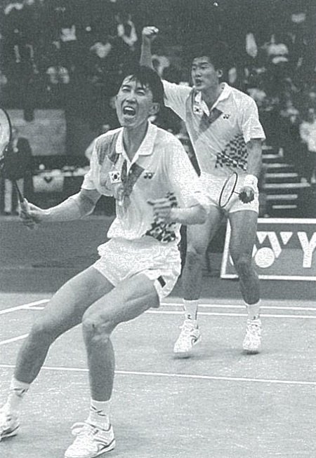 박주봉 한국배드민턴대표팀 감독(앞)이 남자복식 파트너 김문수와 함께 1991년 5월 덴마크 코펜하겐에서 열린 수디르만컵에 출전한 모습. 박 감독은 남자복식은 김문수, 혼합복식은 정명희 화순군청 감독과 호흡을 맞추며 한국의 우승에 앞장섰다. 사진출처|BWF