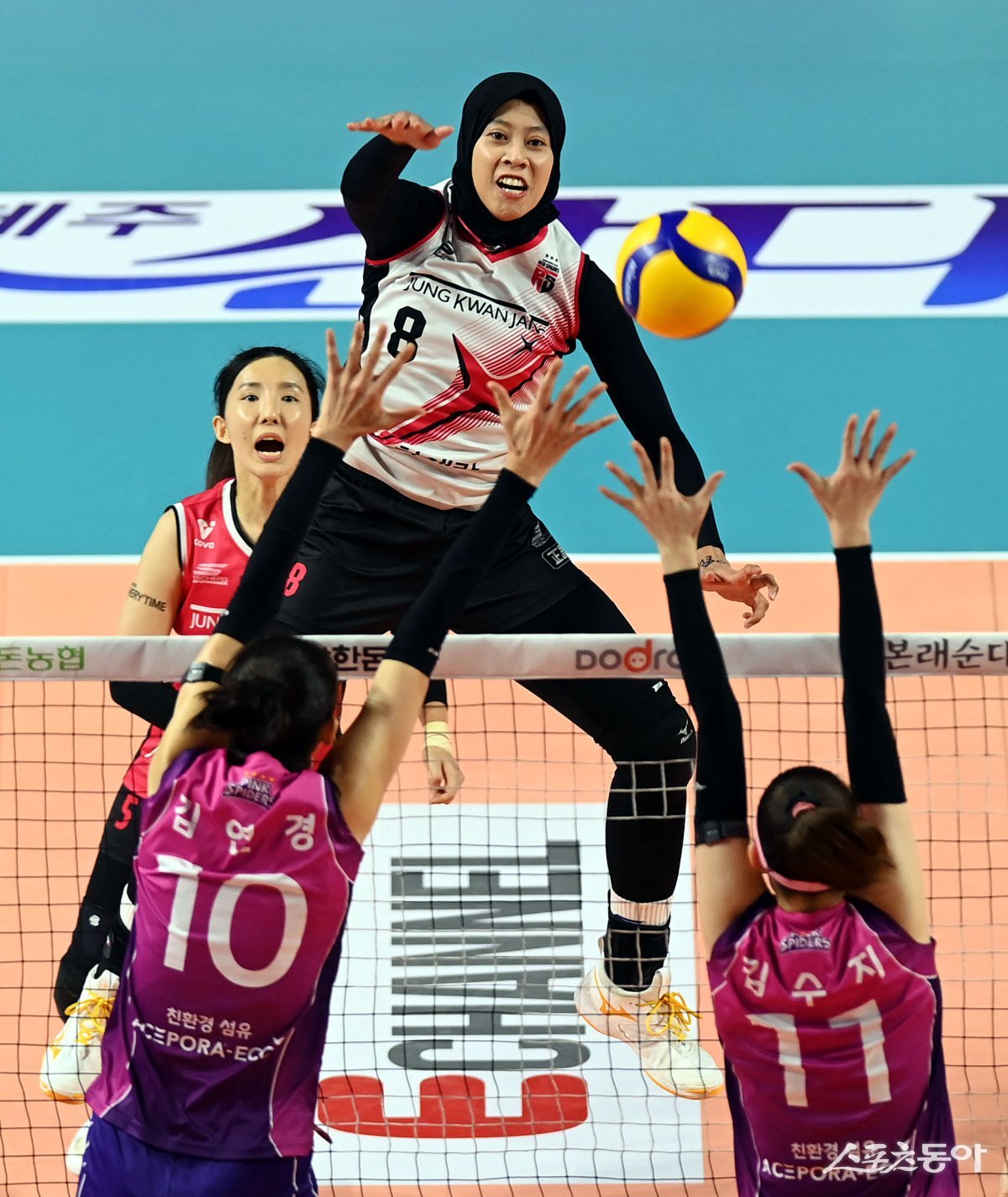정관장 메가(8번)가 8일 인천삼산월드체육관에서 열린 V리그 여자부 챔피언 결정전 5차전에서 흥국생명 블로커 사이로 강한 스파이크 공격을 하고 있다. 인천|김민성 기자 marineboy@donga.com