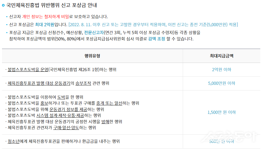 스포츠 승부조작 관련 가담자 신고는 최고 5000만 원이며, 불법스포츠도박 사이트 ▲이용자 ▲설계·제작·유통·제공 ▲중개·알선 ▲운동경기 정보 제공 및 공정한 시행 방지 등의 신고 등은 최고 1500만 원까지 포상금이 지급된다.