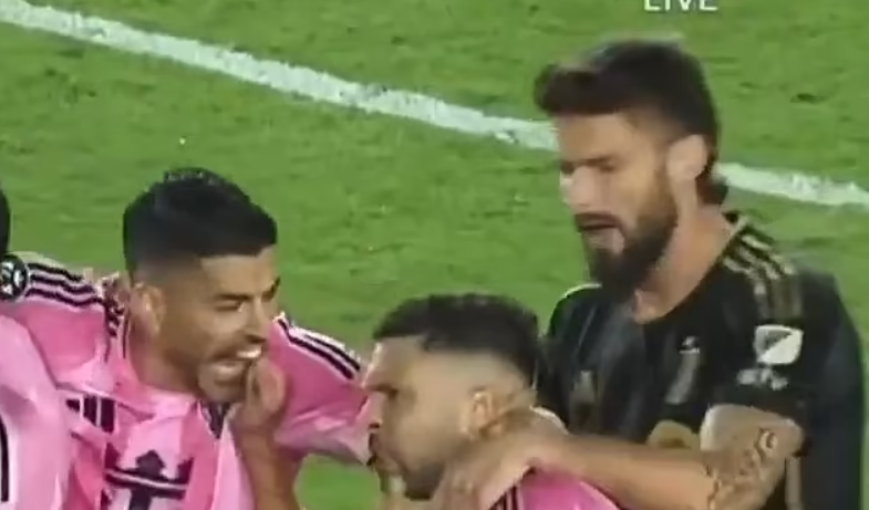 루이스 수아레스(왼쪽)가 10일 미국 플로리다 주의 체이스 스타디움에서 열린 인터 마이애미-LA FC의 2025 CONCACAF 챔피언스컵 8강 2차전 막판 팀 동료 조르디 알바(가운데)의 손을 깨물고 있다. 외신들은 벤치 클리어링 중 자신을 말리던 손이 지루(오른쪽)의 손인 줄 알고 깨물었다고 분석했다. 사진출처|데일리 미러