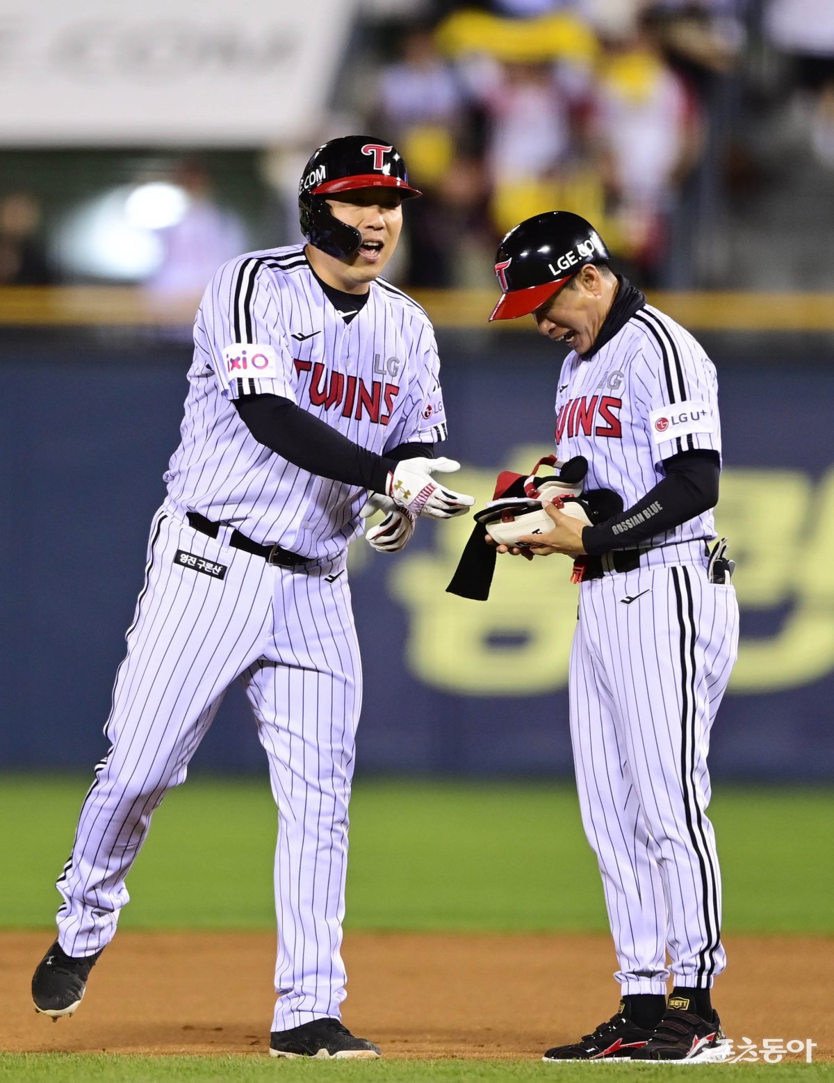 23일 서울 잠실야구장에서 열린 ‘2025 신한 SOL Bank KBO리그’ NC 다이노스와 LG 트윈스의 경기에서 7회말 2사 2, 3루 LG 김현수가 2타점 우전 2루타를 송지만 코치에게 보호 장비를 건네고 있다. 잠실 | 주현희 기자 teth1147@donga.com