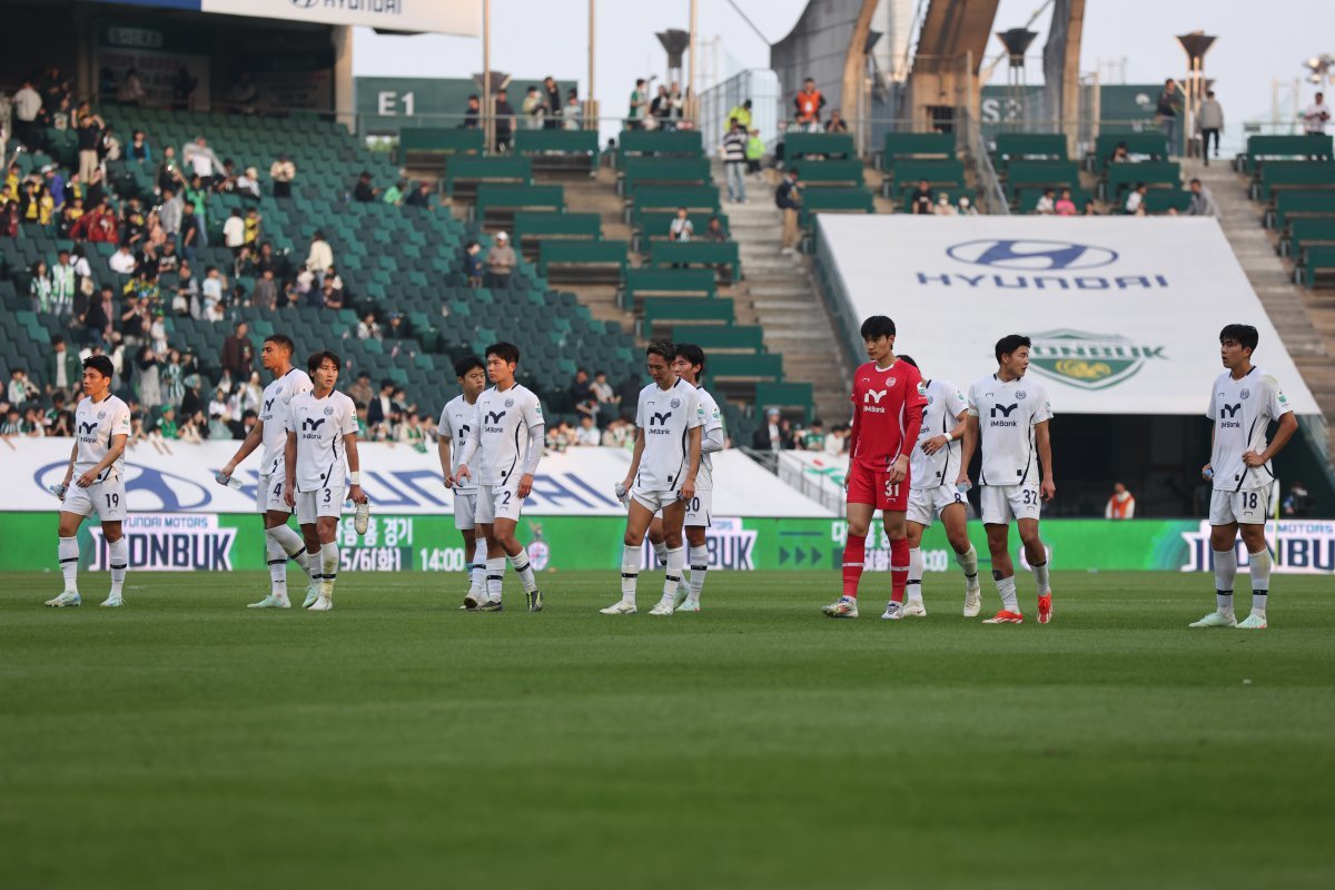 대구는 지난해에 이어 올해도 K리그2 강등 위기에 휩싸였다. 다음달 3일 제주 SK전 이전까지 휴식기가 주어진 터라 하루빨리 분위기를 바꿔야 한다. 20일 전주월드컵경기장에서 열린 전북과 2025 K리그1 9라운드 원정경기에서 1-3으로 패한 뒤 망연자실한 대구 선수들. 사진제공|한국프로축구연맹