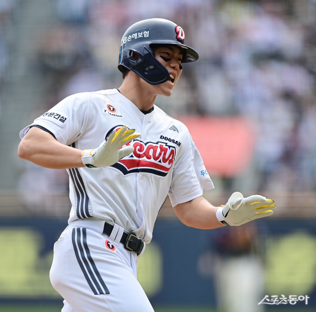 두산 오명진이 27일 잠실구장에서 열린 롯데와 홈경기 4회말 1사 만루서 우월 만루홈런을 친 뒤 세리머니를 펼치고 있다. 오명진은 데뷔 첫 홈런을 만루홈런으로 장식했다. 잠실|주현희 기자 teth1147@donga.com