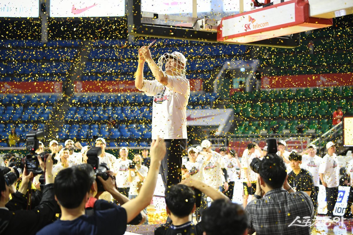 하염없이 기쁨을 눈물을 쏟아낸 조 감독은 “이번 시즌을 앞두고 선수 8명이 바뀌었고, 개막 이후엔 아셈 마레이 등 부상자들이 적지 않아 쉽지 않은 시즌이 될 것으로 봤다”면서도 “양준석, 유기상, 정인덕이 예상보다 정말 많이 성장해 이 자리에 올랐다”고 말했다. 이어 “내가 수비에 많은 변화를 주는 편인데 선수들이 정규리그뿐 아니라 PO와 챔피언 결정전에서 너무 잘해줬다. 정말 고맙다”고 모든 공을 선수들에게 돌렸다.