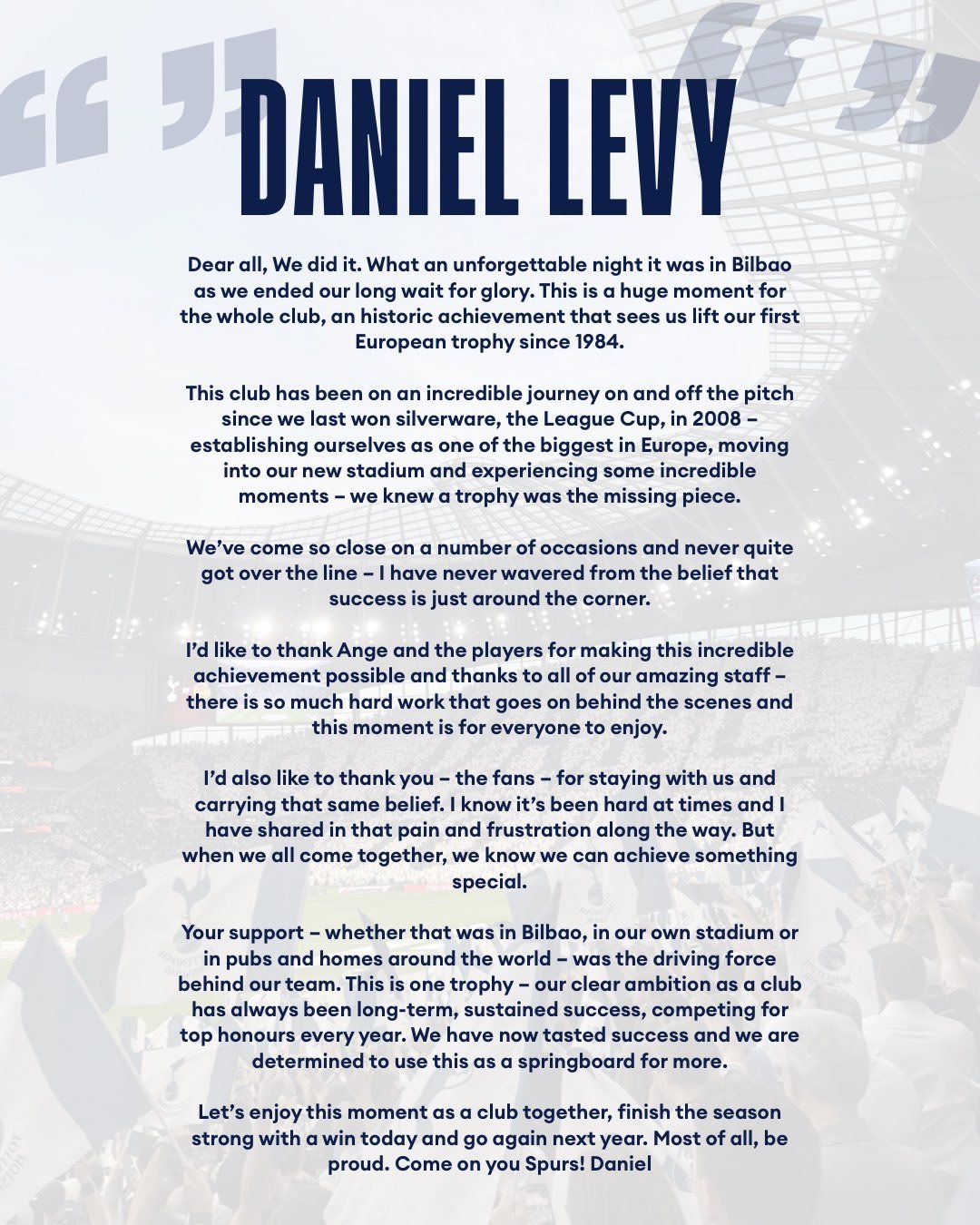 토트넘은 25일(한국시간) 구단 홈페이지를 통해 레비 회장의 메시지를 공개했다. 그는 “우리가 드디어 해냈다. 빌바오에서의 그 밤은 평생 잊지 못할 것이다. 유럽축구연맹(UEFA) 유로파리그(UEL) 우승은 구단 역사에 길이 남을 위업”이라고 밝혔다. 사진출처|토트넘 홈페이지
