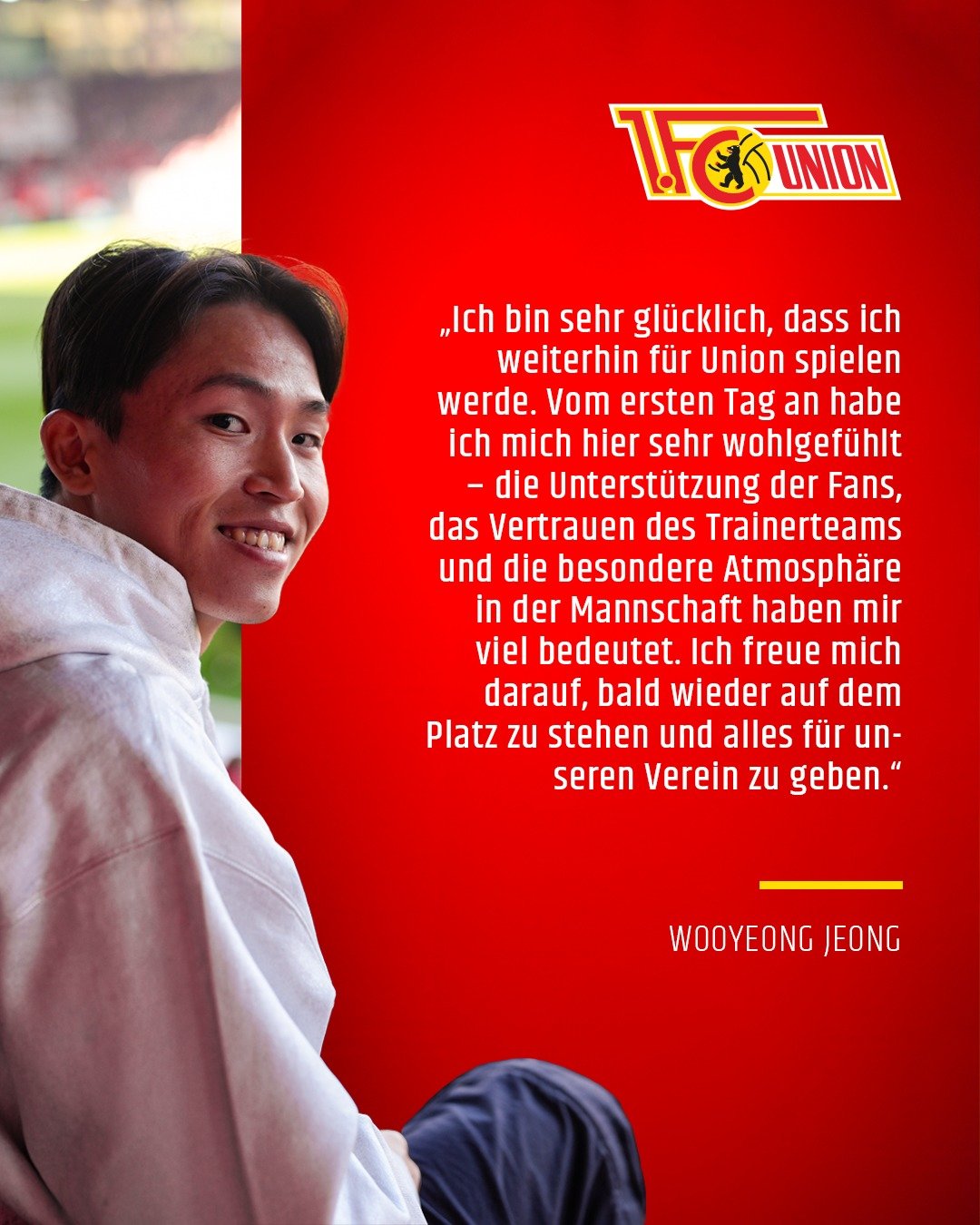 결국 팀에 남게 된 정우영은 구단을 통해 “우니온 베를린에서 계속 뛰게 돼 정말 행복하다. 이 팀에 온 첫날부터 편안했다”며 “빨리 그라운드로 복귀해 팀을 위해 모든 것을 쏟겠다”고 소감을 전했다.