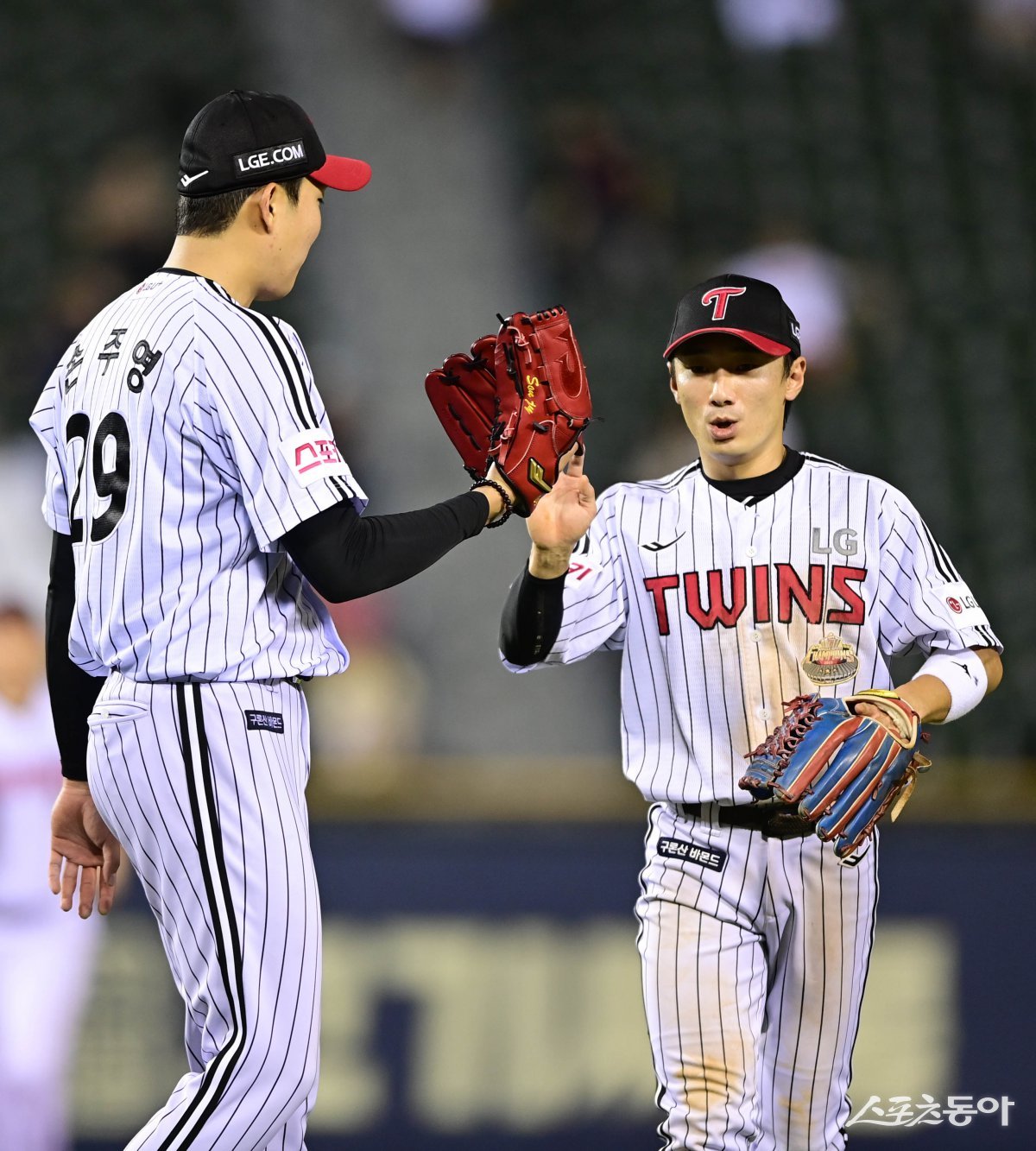 LG 손주영(왼쪽)과 신민재. 스포츠동아DB