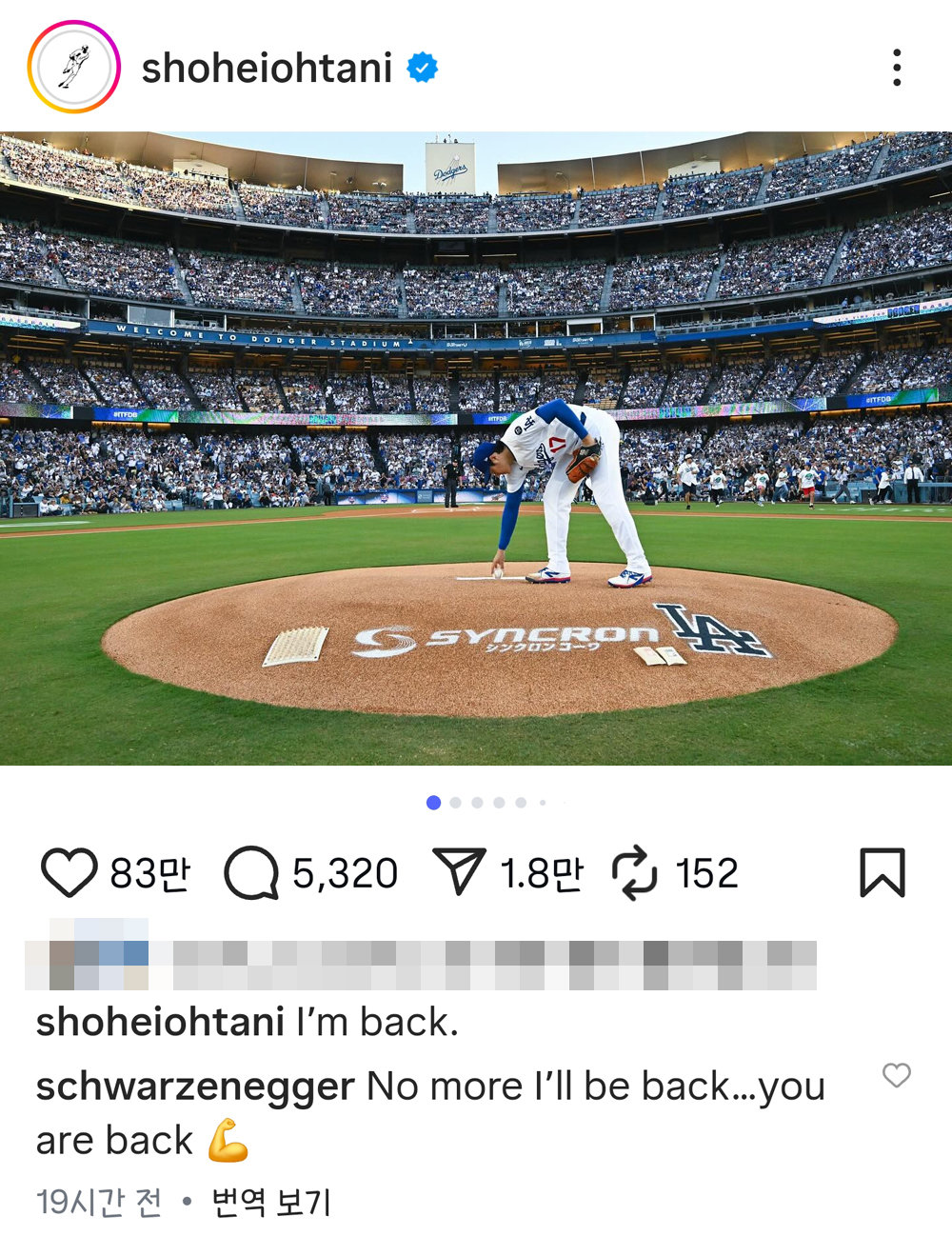 이후 슈워제네거가 이 게시물에 좋아요와 댓글을 남긴 것. 슈워제네거는 ’No more I’ll be back…you are back’라며 오타니의 복귀를 반겼다.