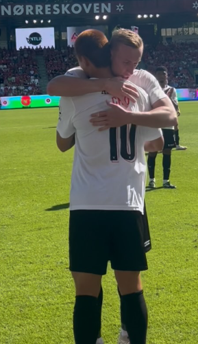 조규성(앞)은 17일(한국시간) 바일레 스타디온에서 벌어진 바일레 BK와 2025~2026시즌 덴마크 수페르리가 5라운드 원정경기에서 후반 45분 아담 북사(뒤) 대신 교체투입돼 그라운드를 누볐다. 448일만의 복귀전을 앞두고 북사로부터 격려가 담긴 포옹을 받는 모습. 사진출처│미트윌란 인스타그램