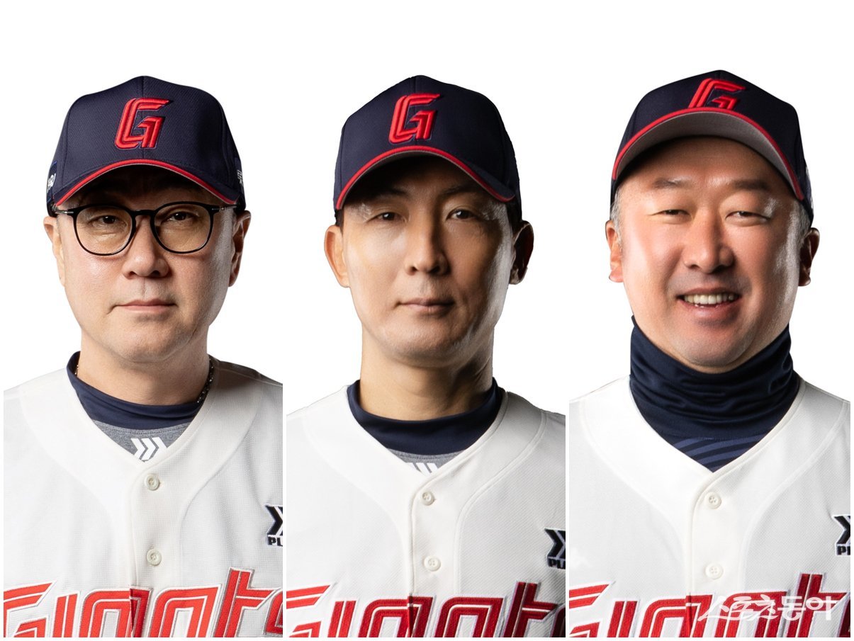 김태형 롯데 감독이 1군 코칭스태프를 대거 교체하며 분위기 쇄신에 나섰다. 28일 사직 KT전을 앞두고 콜업된 김상진, 김현욱 투수코치와 이병규 타격코치(왼쪽부터)가 1군 핵심 코칭스태프로 활약할 전망이다. 사진제공|롯데 자이언츠