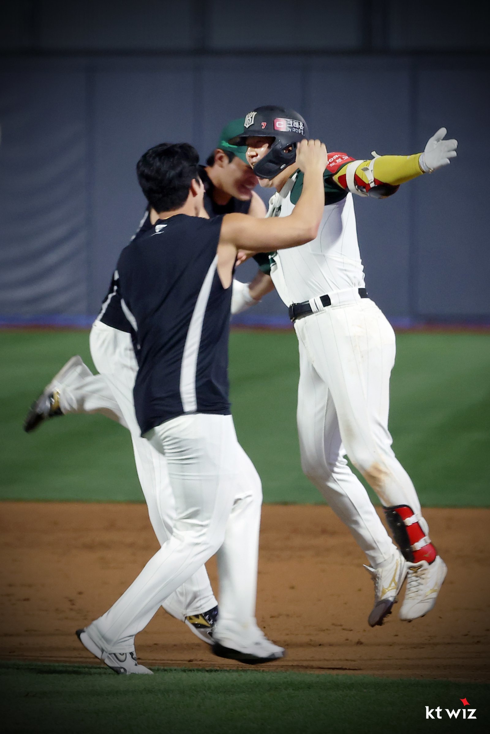 KT 김상수가 31일 수원KT위즈파크에서 열린 KIA와 홈경기 9회말 끝내기 2타점 2루타를 친 뒤 동료들과 환호하고 있다. KT는 김상수의 활약에 힘입어 KIA를 7-6으로 꺾고 위닝시리즈를 작성했다. 사진제공|KT 위즈