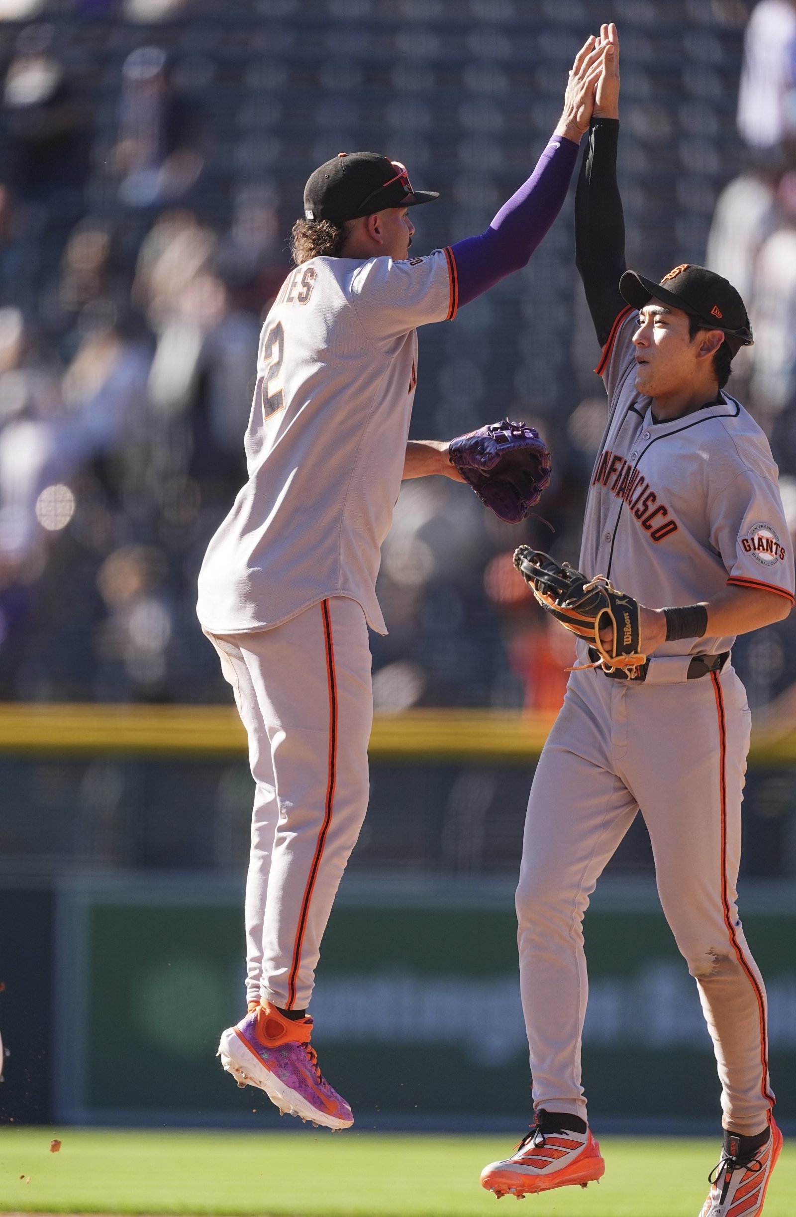 샌프란시스코 이정후(오른쪽)가 2일(한국시간) 쿠어스필드에서 열린 콜로라도전에서 3타수 1안타 1볼넷을 기록했다. 팀의 8-2 승리 직후 윌리 아다메스와 하이파이브를 하는 이정후. 덴버(미 콜로라도주)|AP뉴시스