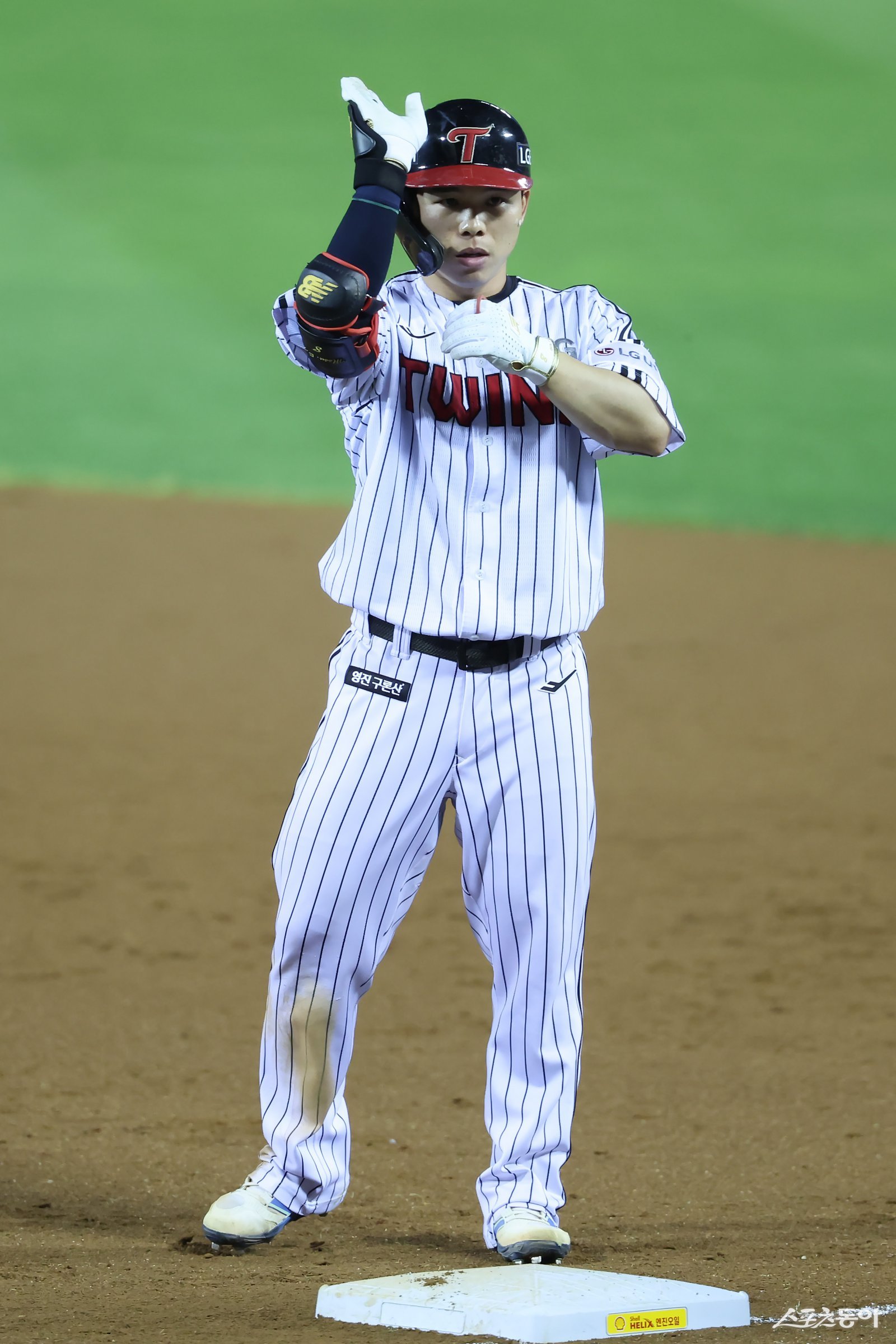LG 문성주가 2일 잠실구장에서 열린 롯데전 1회말 우전안타를 친 뒤 덕아웃을 향해 세리머니를 펼치고 있다. LG는 문성주의 4타수 4안타 활약에 힘입어 롯데를 3-2로 제압했다. 사진제공|LG 트윈스