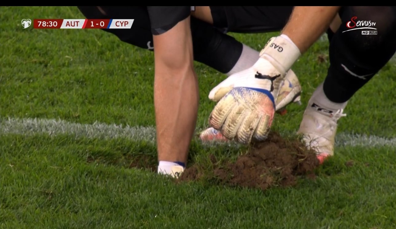 현장을 확인한 오스트리아 골키퍼 알렉산더 슐라거는 손으로 잔디를 뜯어내며 땅이 꺼져 있는 상황을 직접 보여줬고, 이 모습이 중계 화면에 잡혔다. 곧장 그라운드 관리 요원들이 양동이를 들고 뛰어 들어와 긴급 보수 작업을 진행했고, 슐라거까지 직접 복구에 힘을 보태는 진풍경이 연출됐다. 약 10분가량의 지연 끝에 경기는 재개됐으며, 추가 시간은 10분이 주어졌다.