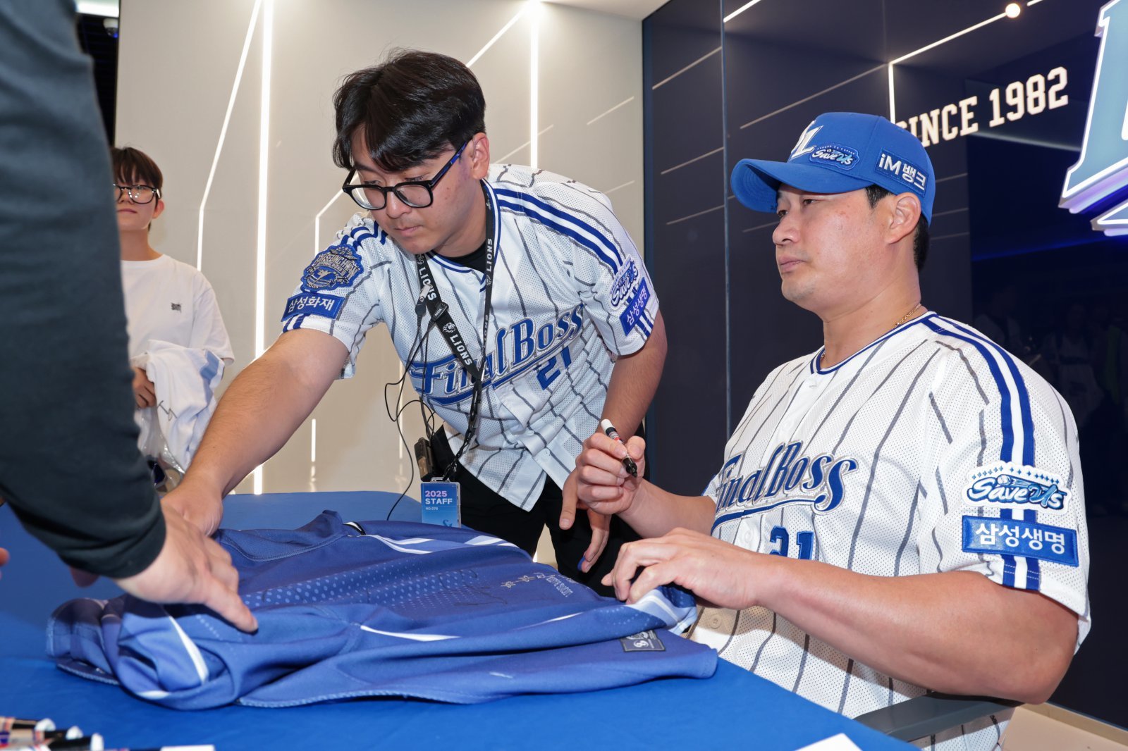 삼성 오승환(오른쪽)이 30일 대구삼성라이온즈파크에서 열린 은퇴식에 앞서 진행된 사인회에서 팬들에게 사인을 해주고 있다. 사진제공|삼성 라이온즈