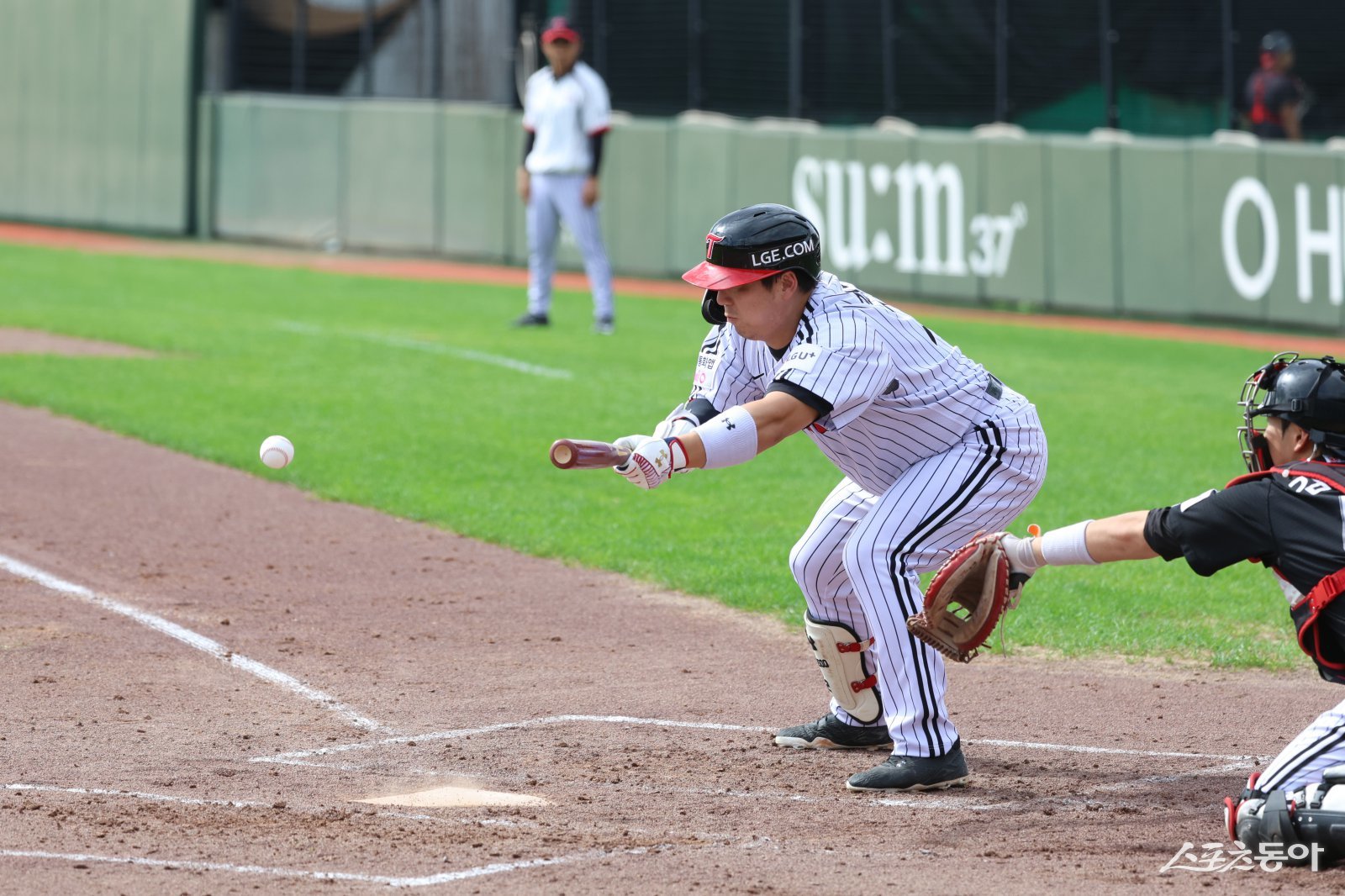 이날 청백전에는 명확한 지시사항이 한 가지 있었다. 타자들은 초구에 번트를 댄 뒤, 타구 결과에 관계없이 다시 타석에 들어서 타격을 했다. 중심타자 오스틴 딘과 문보경을 제외한 모든 타자가 번트를 댔다. 염경엽 LG 감독은 “(문)보경이는 입소한 뒤 타격 훈련을 많이 소화하다 보니 왼쪽 손목의 상태가 좋지 않아 공을 보는 데 집중했다”고 밝혔다. 오스틴에 대해선 “팀마다 번트를 대지 않는 선수도 있지 않으냐”며 웃었다.