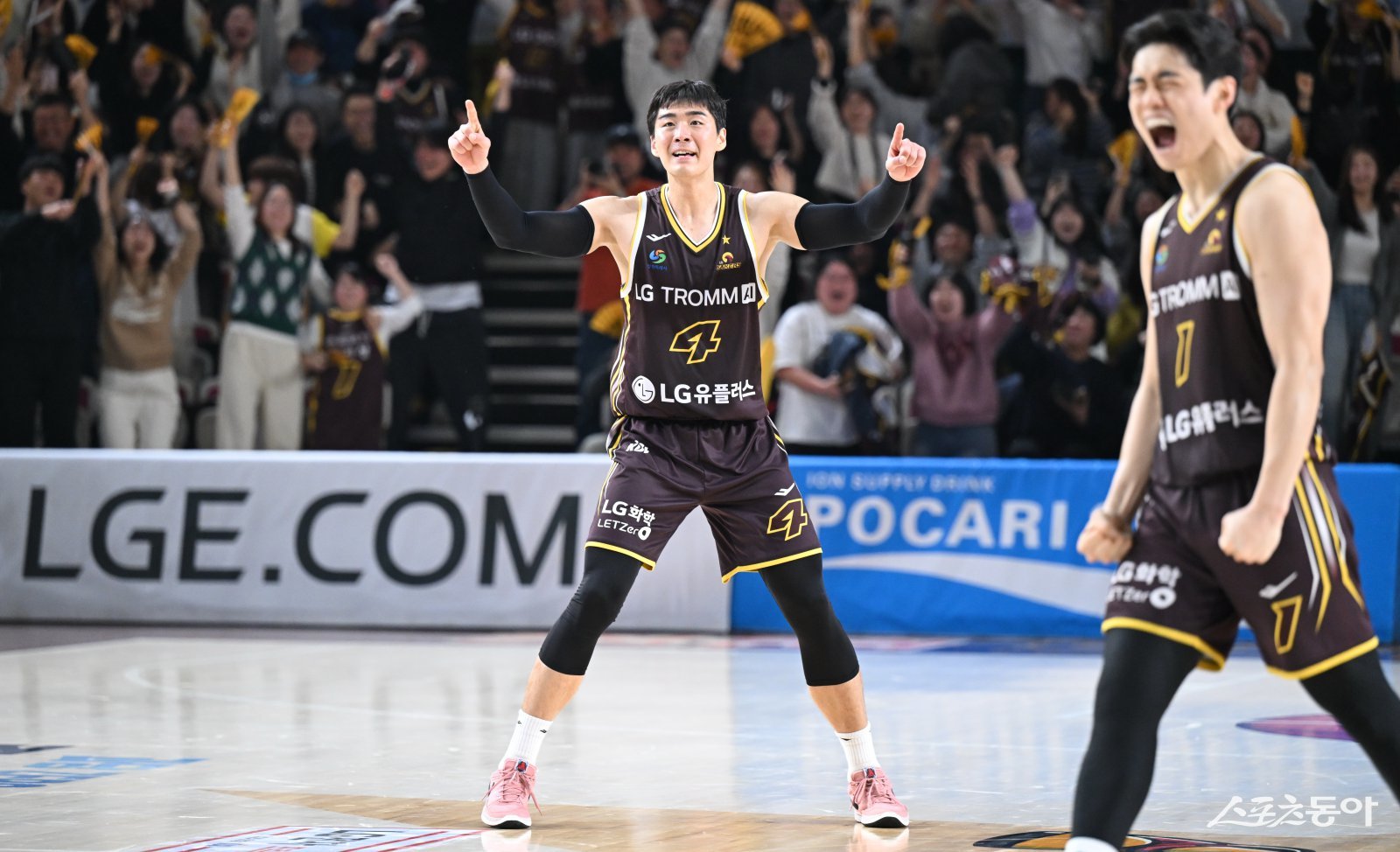 LG 양홍석이 7일 창원체육관에서 열린 KT전 종료 24초 전 역전 결승 3점슛을 터트린 뒤 세리머니를 펼치고 있다. 사진제공|KBL