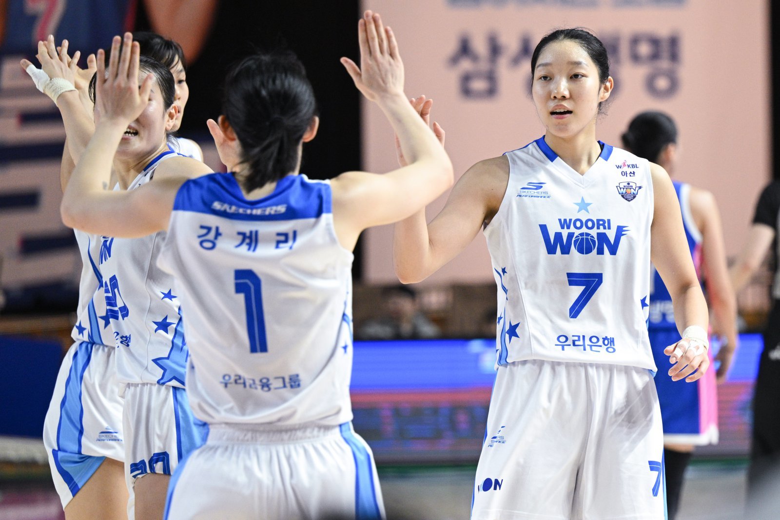 우리은행은 7일 용인실내체육관에서 열린 ‘BNK금융 2025~2026 여자프로농구’ 2라운드 용인 삼성생명과 원정경기서 62-59로 이겼다. 이날 승리로 리그 최하위(2승5패) 탈출의 시동을 걸었다.
