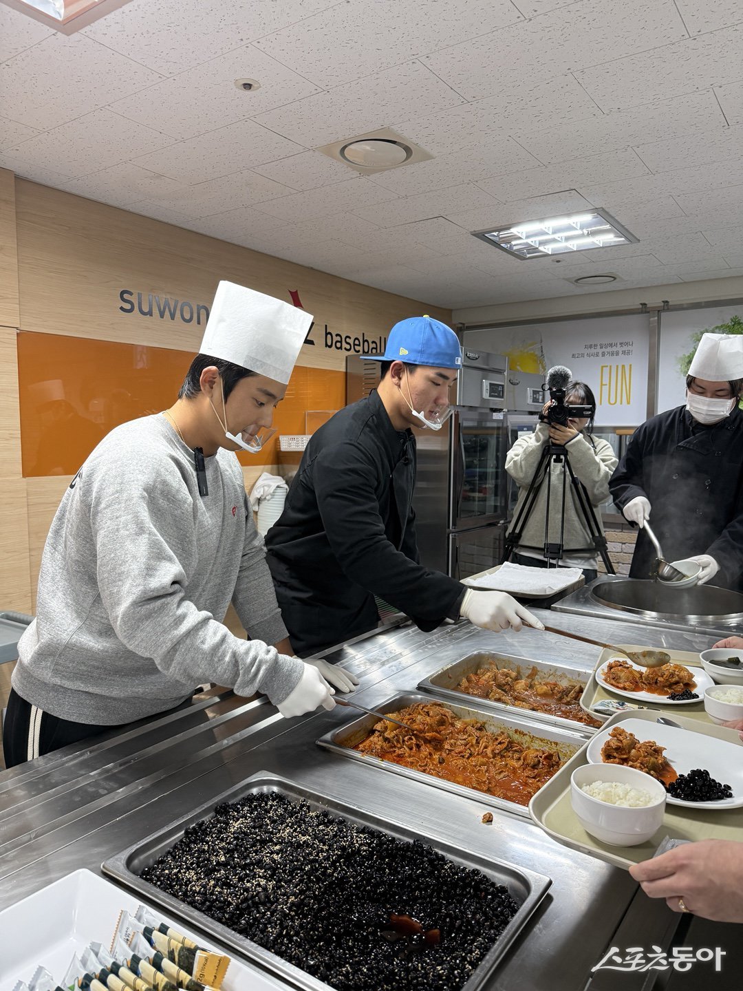 KT 안현민이 6일 수원KT위즈파크 구내식당에서 팬 46명에게 제공한 요리. 닭복음탕과 미역국은 안현민이 취사병 복무 시절 가장 자신 있어 한 메뉴다. 사진제공|KT 위즈