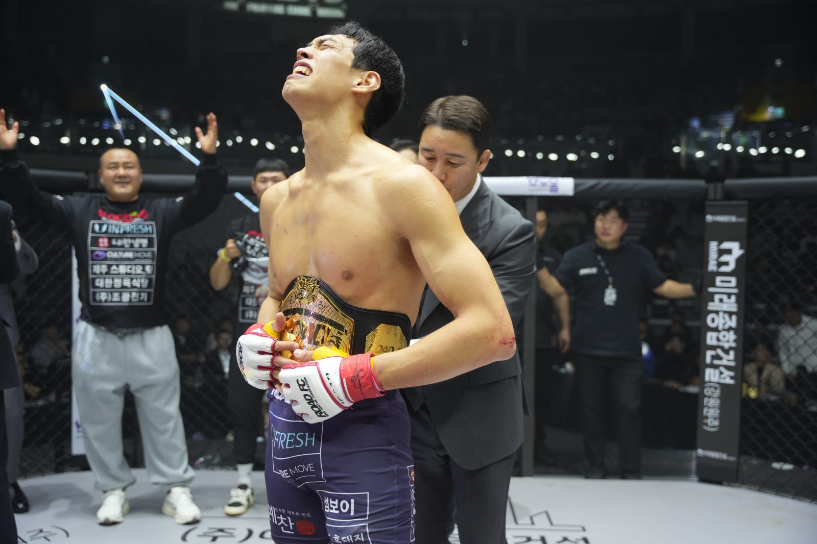 윤태영(앞)이 7일 장충체육관에서 열린 ‘굽네 로드FC 075’에서 로드FC 웰터급 초대 챔피언에 오른 뒤 정문홍 로드FC 회장으로부터 벨트를 받고 있다. 사진제공|로드FC