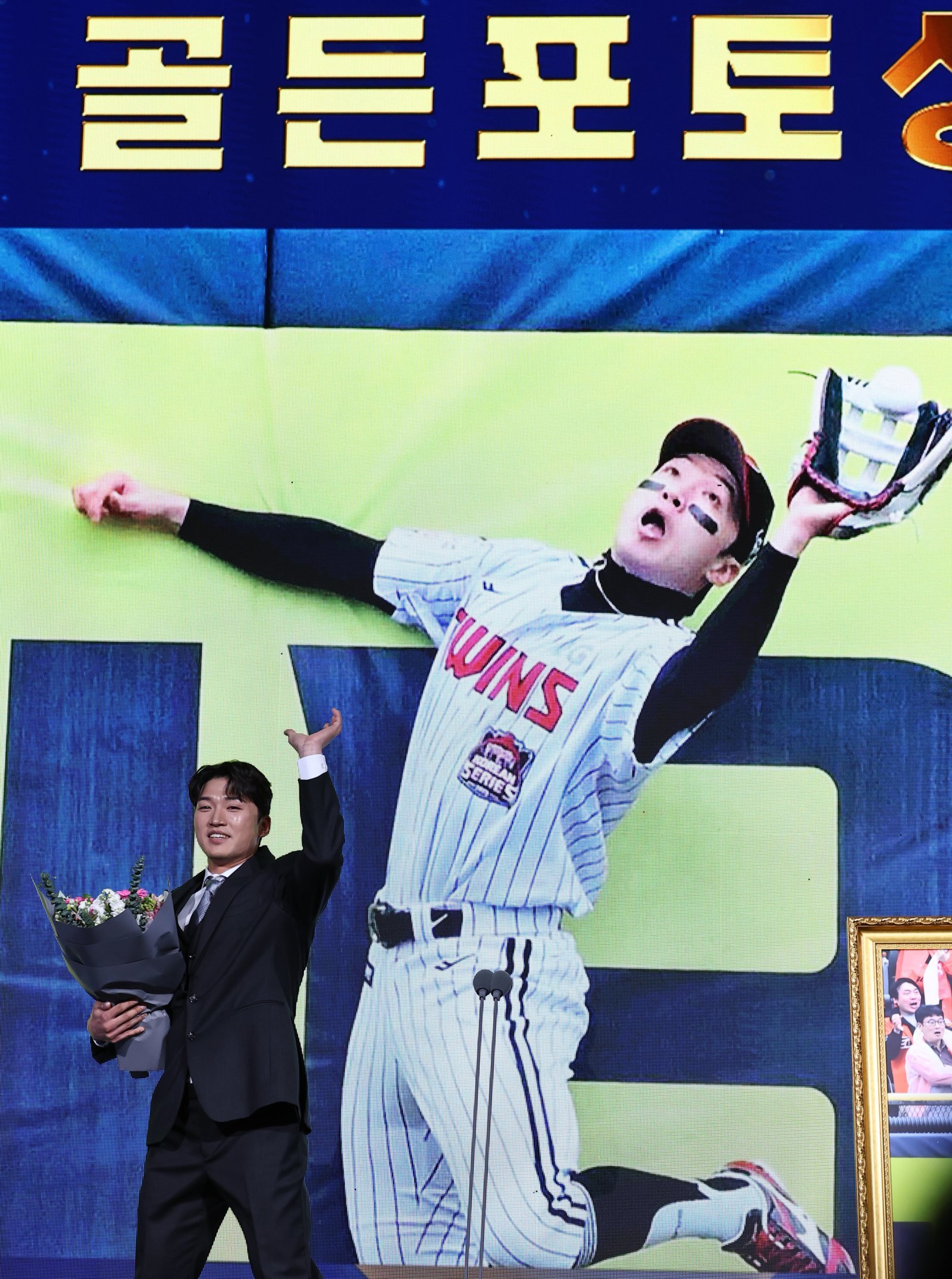 LG 박해민이 9일 서울 송파구 롯데호텔월드에서 2025시즌 골든글러브 시상식에서 골든포토상 기념촬영을 하고 있다. 잠실|뉴시스