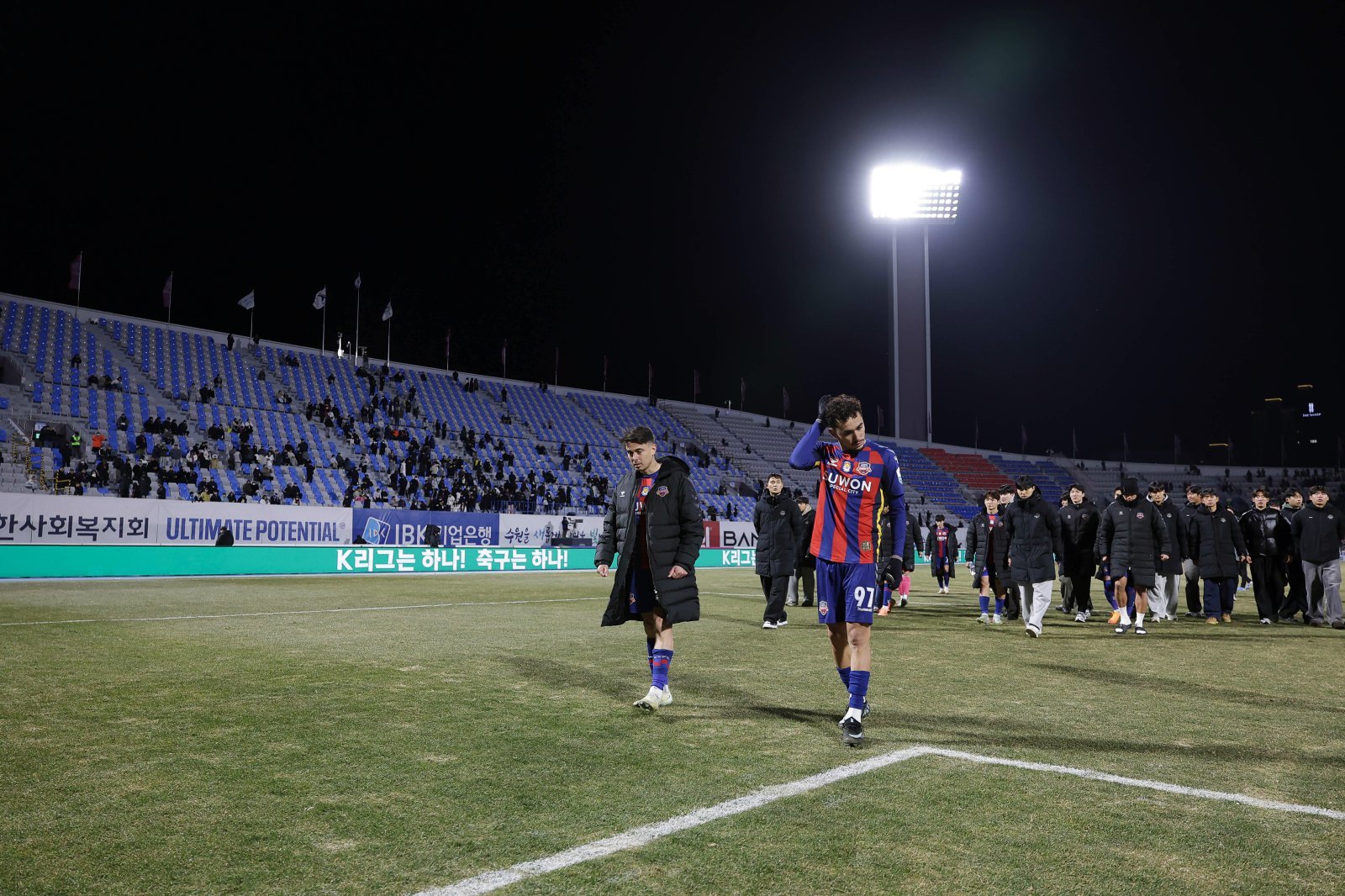 수원FC는 올 시즌 B팀을 운영한 까닭에 선수를 49명이나 보유했지만 정작 고비에서 쓸만한 선수는 적었다. 사진은 8일 수원종합운동장에서 열린 부천과 승강 PO 2차전 홈경기에서 패해 K리그2로 강등된 뒤 고개를 떨군 선수들. 사진제공│한국프로축구연맹