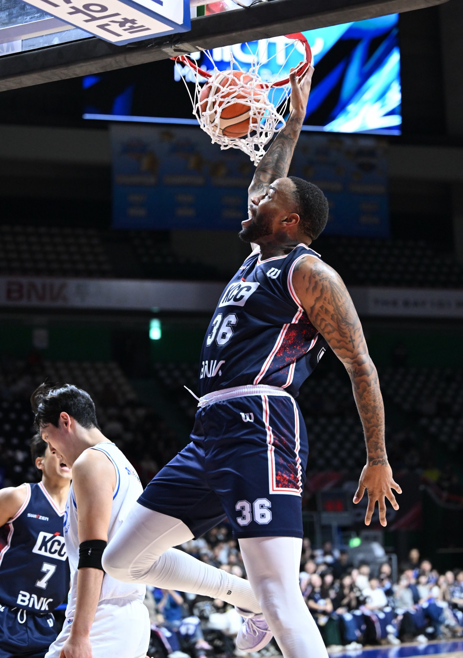 KCC 숀 롱이 18일 부산서 열린 가스공사와 홈경기서 덩크슛을 시도하고 있다. 그는 28점을 넣으며 4연승을 이끌었다. 사진제공|KBL