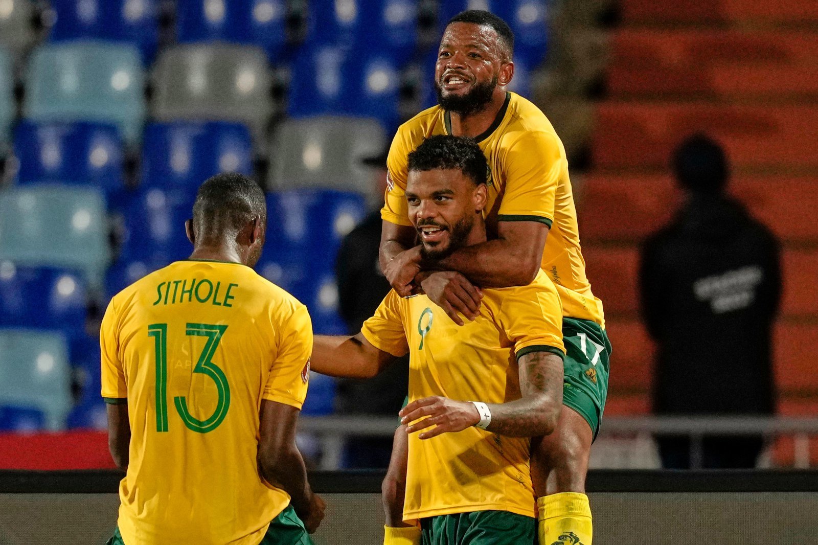 남아공 라일 포스터(가운데)가 23일 모로코 마라케시 스타디움서 열린 앙골라와 아프리카 네이션스컵 조별리그 1차전서 후반 결승골을 뽑은 뒤 동료들의 축하를 받고 있다. 마라케시(모로코)|AP뉴시스