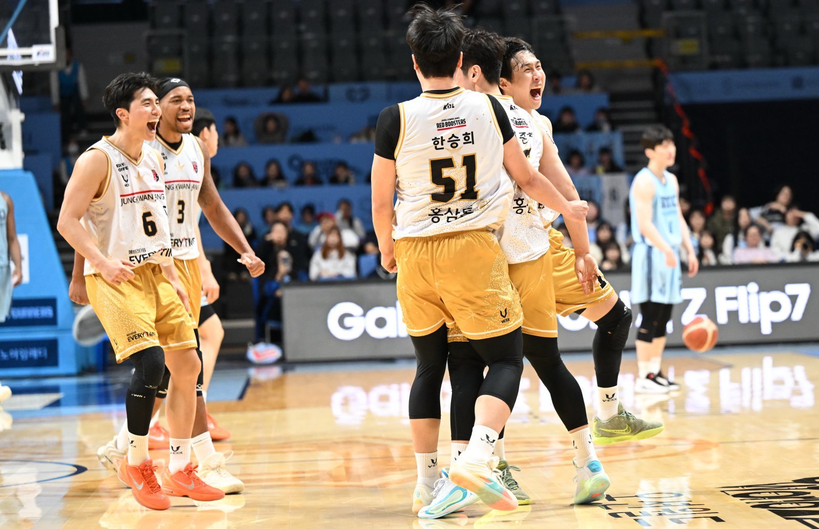 정관장 선수들이 22일 안양 정관장 아레나서 열린 ‘2025~2026 LG전자 프로농구’ 정규리그 삼성전에서 연장 혈투 끝에 90-82로 이긴 뒤 함께 기뻐하고 있다. 사진제공|KBL
