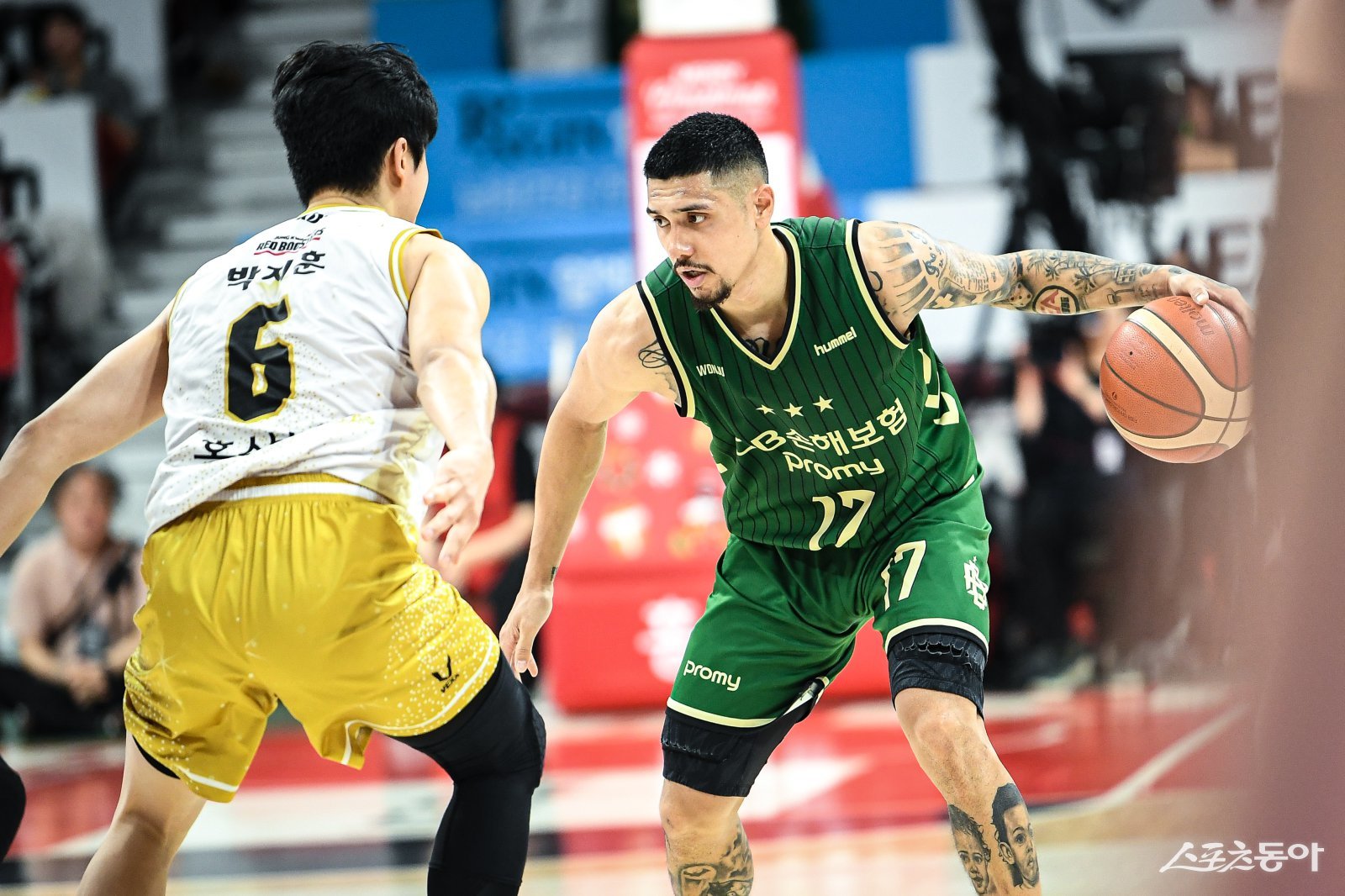DB 이선 알바노가 25일 안양정관장아레나에서 열린 정관장전 도중 돌파를 시도하고 있다. 사진제공|KBL