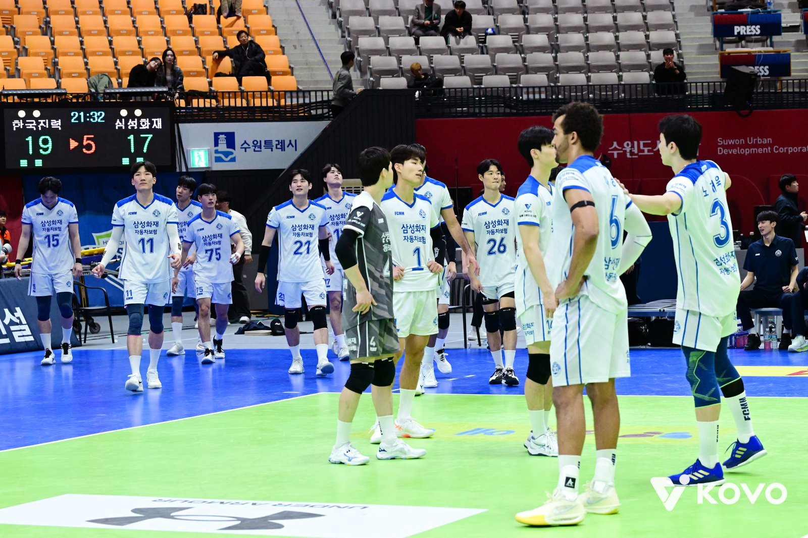 삼성화재 선수들이 23일 한국전력과 원정경기서 2-3으로 패한 뒤 아쉬워하고 있다. 사진제공|KOVO
