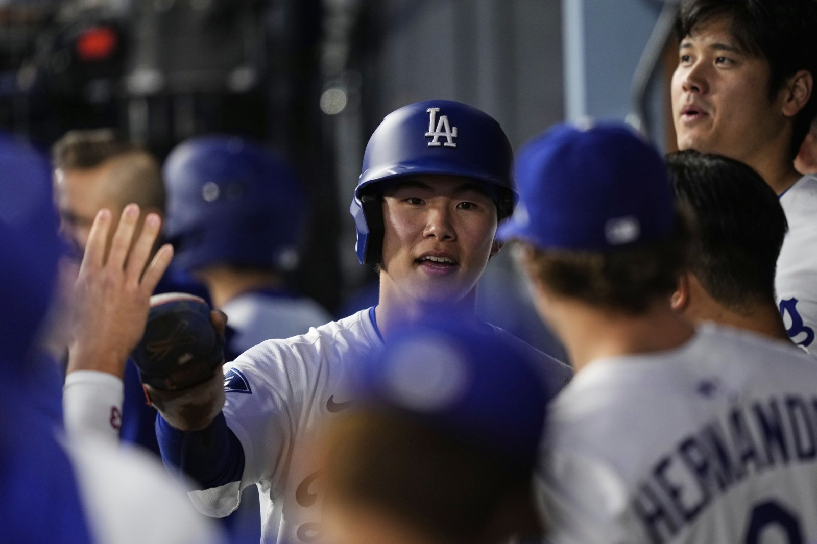 다저스 김혜성(가운데)은 라인업의 노쇠화 문제를 해결할 수 있을까. 특히 다저스의 2루는 다음 시즌 보강이 시급한 포지션으로 평가받고 있다. AP뉴시스