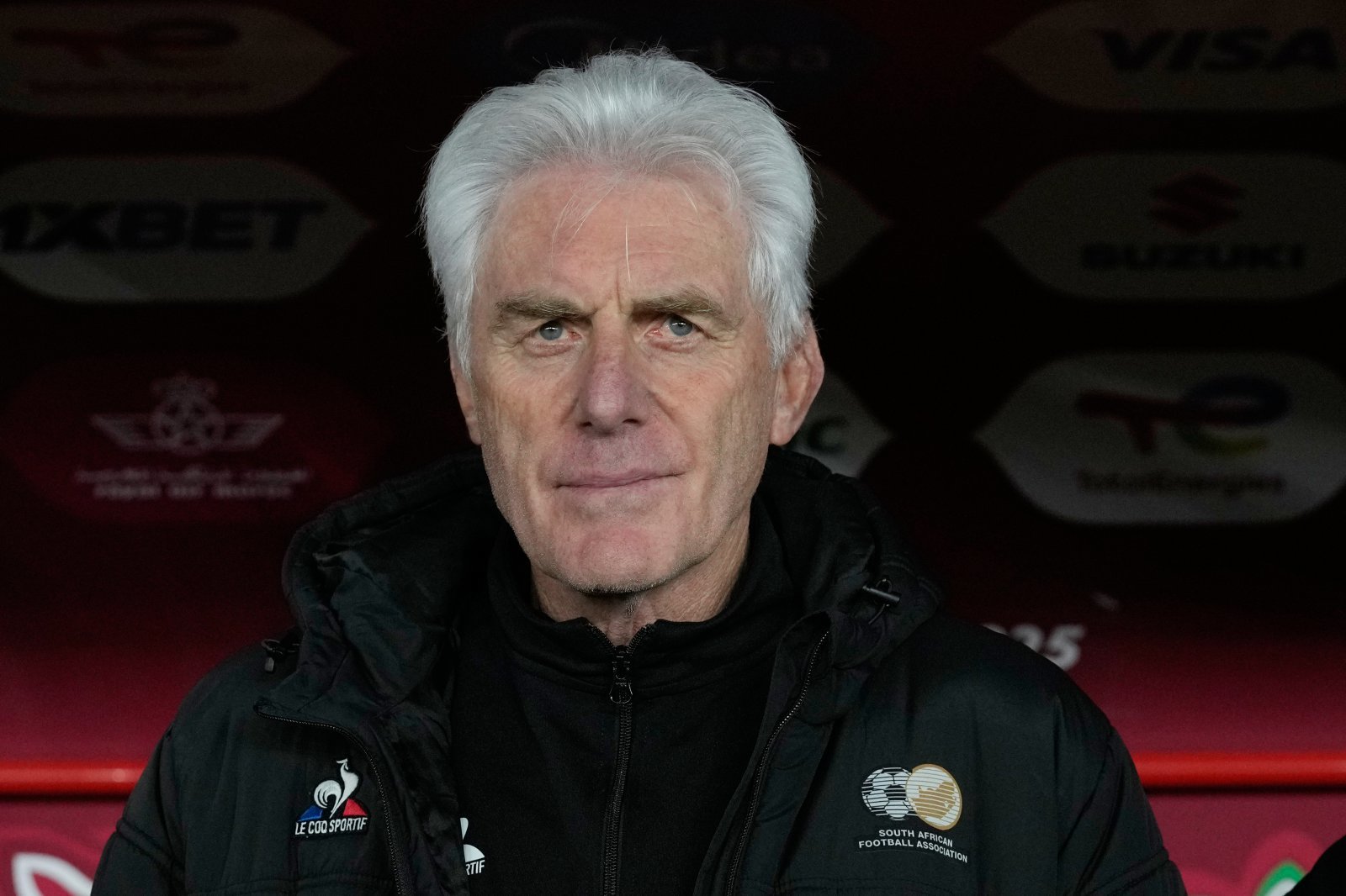 남아공 위고 브로스 감독이 5일(한국시간) 열린 카메룬과 네이션스컵 16강전 도중 벤치에서 그라운드를 바라보고 있다. 라바트(모로코)|AP뉴시스