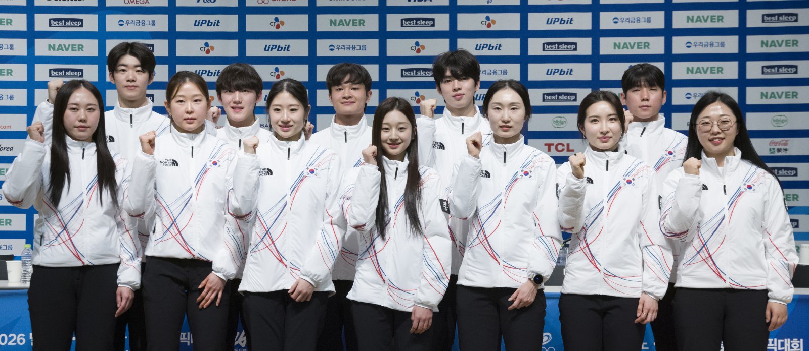 7일 진천선수촌에서 밀라노동계올림픽 D-30 미디어데이에 참석한 선수들이 기념촬영을 하고 있다. 스피드스케이팅 박지우, 쇼트트랙 이준서, 스피드스케이팅 김민선, 쇼트트랙 임종언, 피겨스케이팅 이해인, 김현겸, 신지아, 차준환, 쇼트트랙 최민정, 김길리, 컬링 정영석, 김선영(왼쪽부터). 진천|뉴시스