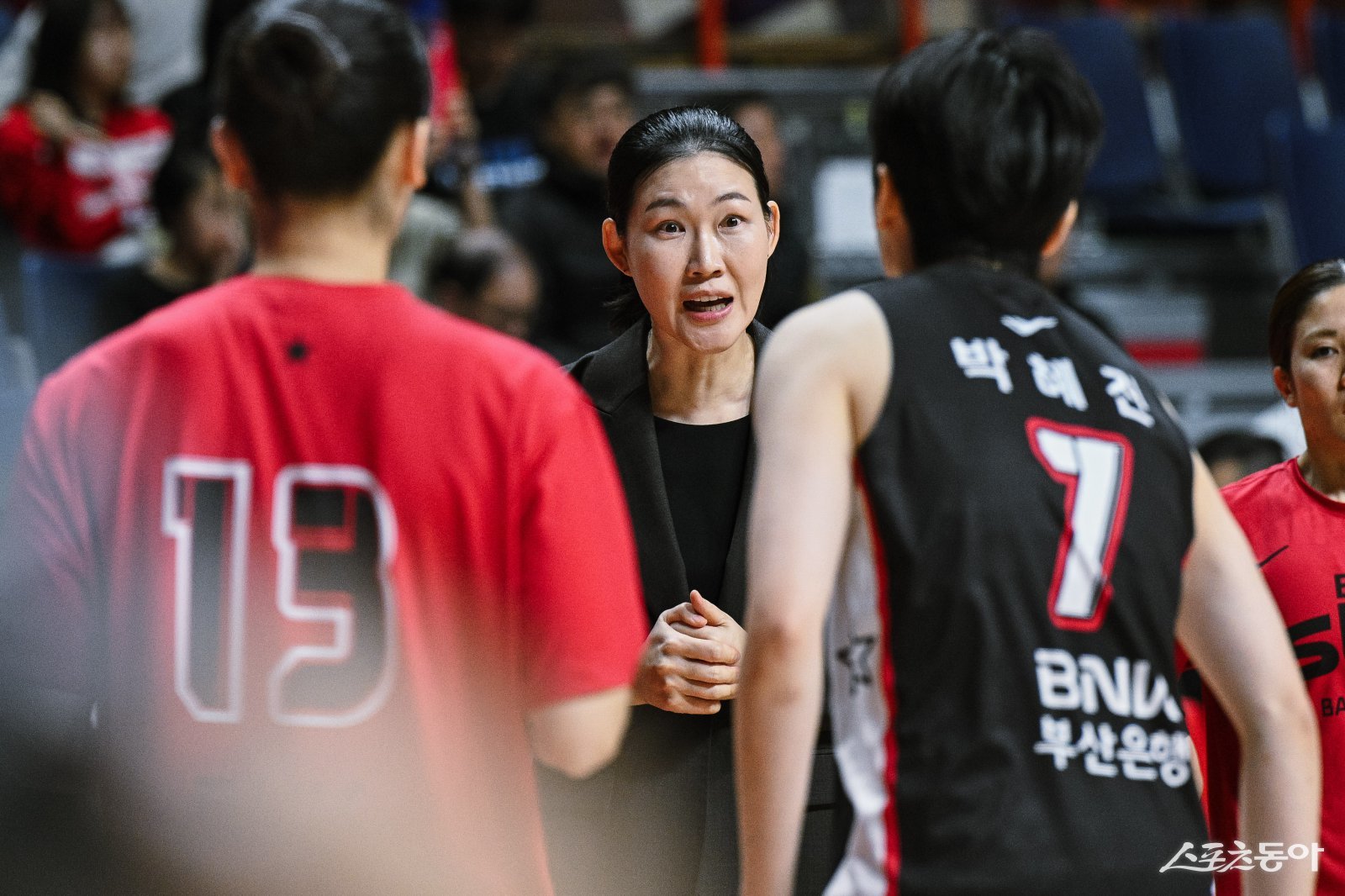 박정은 BNK 썸 감독이 14일 사직체육관에서 열린 하나은행전 도중 작전을 지시하고 있다. 사진제공|WKBL