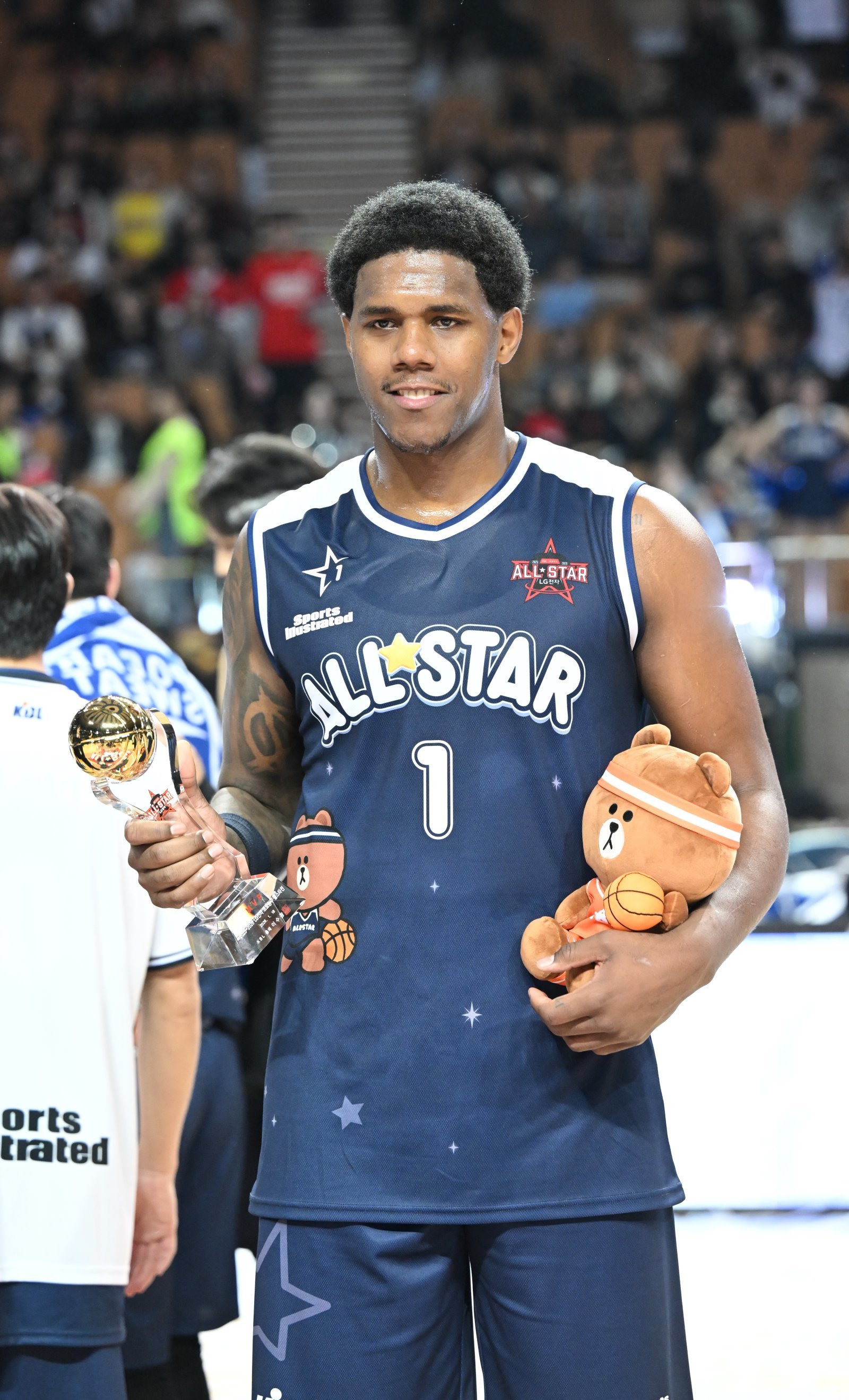 네이던 나이트가 18일 잠실체육관서 열린 ‘2025~2026 LG전자 프로농구 올스타전’에서 최우수선수(MVP)에 선정된 뒤 트로피와 브라운 인형을 들어 올리고 있다. 사진제공|KBL