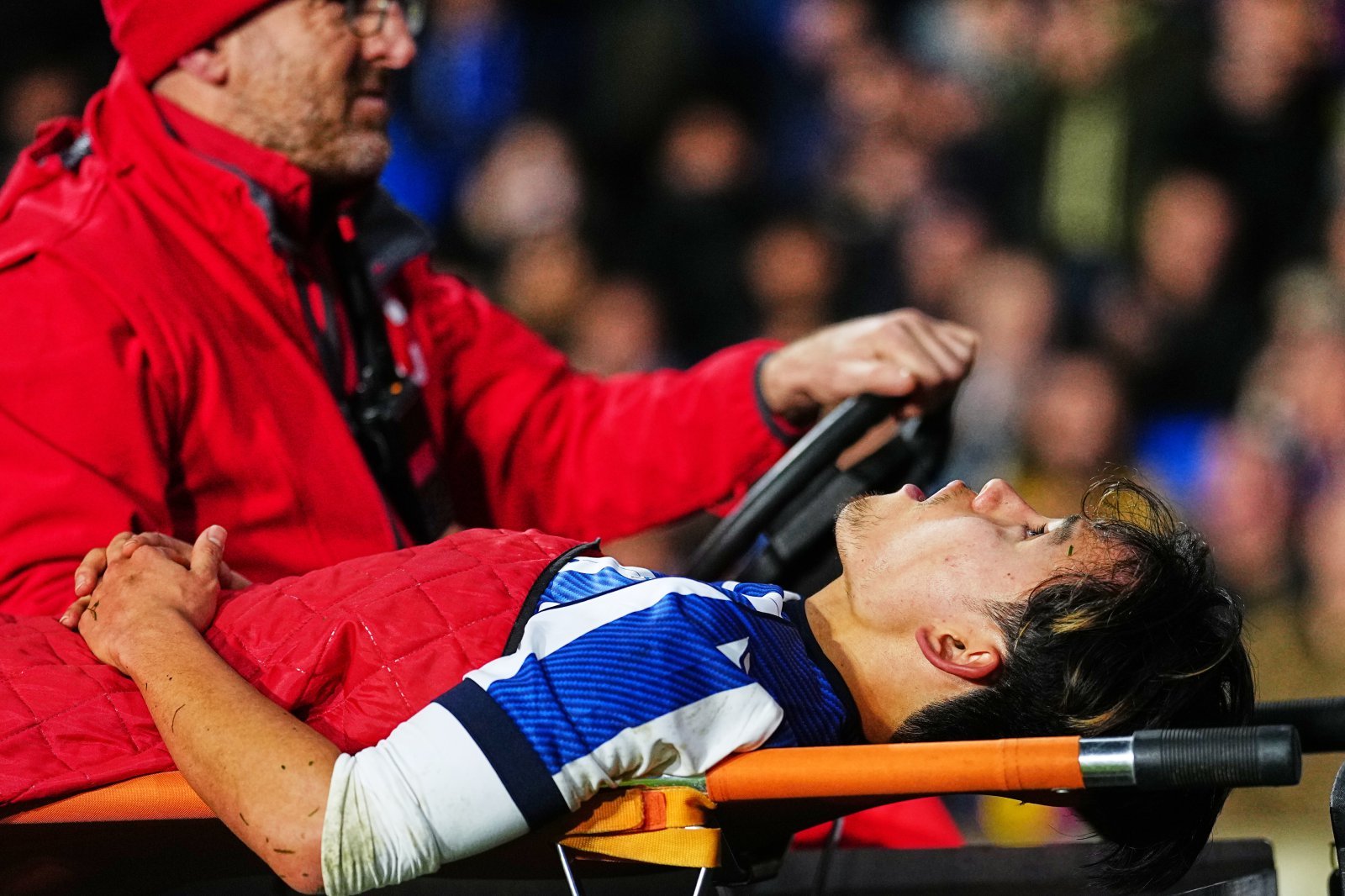 레알 소시에다드 구보 다케후사가 19일(한국시간) FC바르셀로나와 홈경기 도중 왼쪽 햄스트링을 다쳐 들것에 실려 경기장을 빠져나가고 있다. 산세바스티안|AP뉴시스