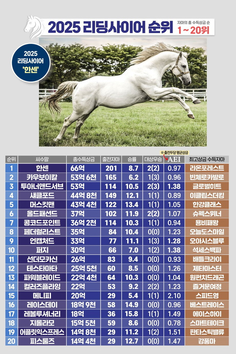 여기서 주목할 말이 닉스고다. 국내에서는 아직 씨수말 활동을 시작하지 않아 이번 순위에 이름이 없지만, 미국에서 먼저 데뷔한 자마들이 승전보를 전해옴에 따라 국내 생산 농가 사이에서 인기가 급상승하고 있다. 닉스고는 향후 한국 경마 혈통 지도를 바꿀 핵심 씨수말 후보로 평가받는다.