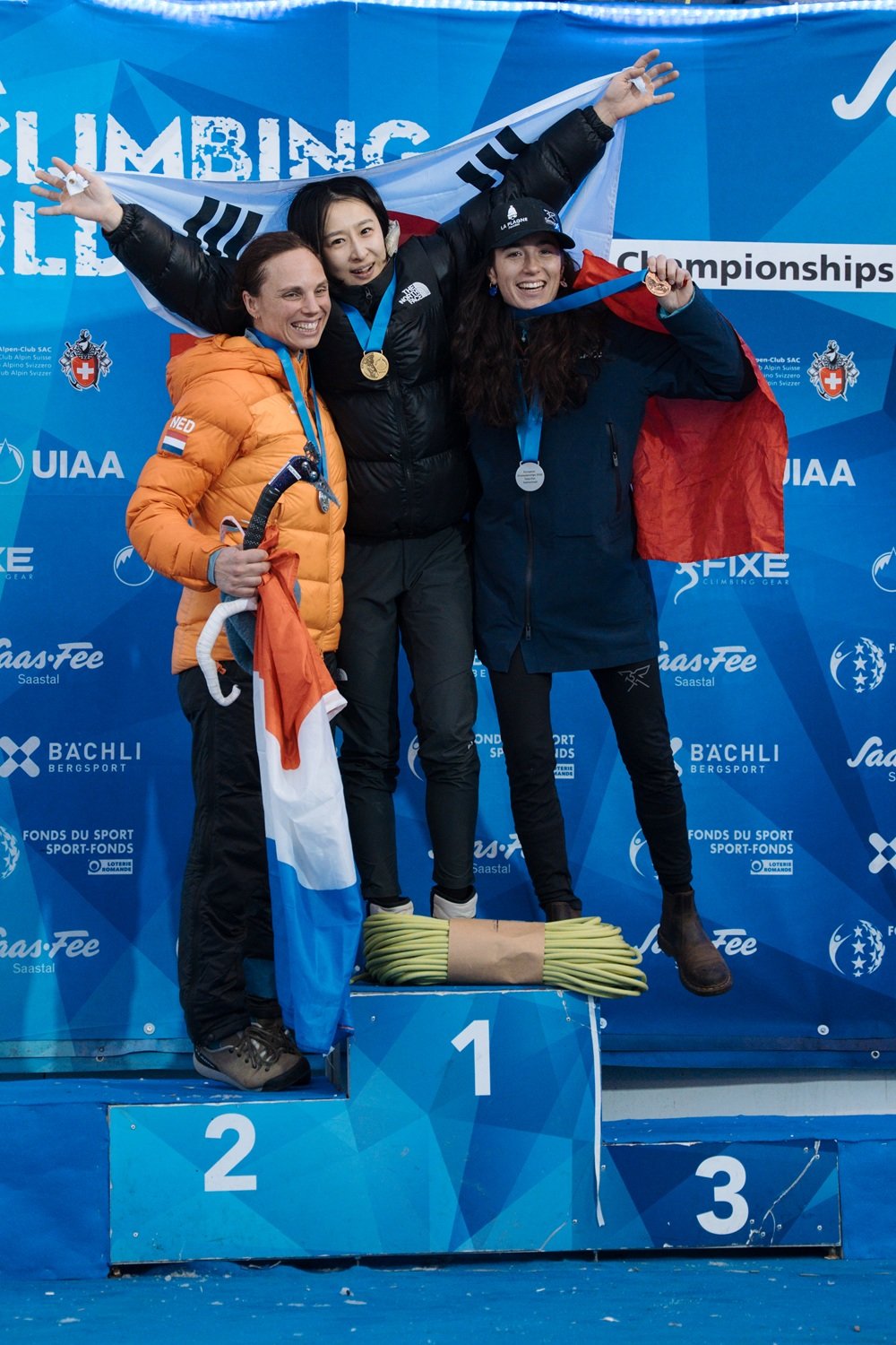 ‘2026 사스페 아이스클라이밍 월드컵’ 여자 리드 부문에서 우승한 노스페이스 애슬리트팀 신운선(가운데)이 시상식에서 기념 촬영을 하고 있다. 사진제공 | 노스페이스