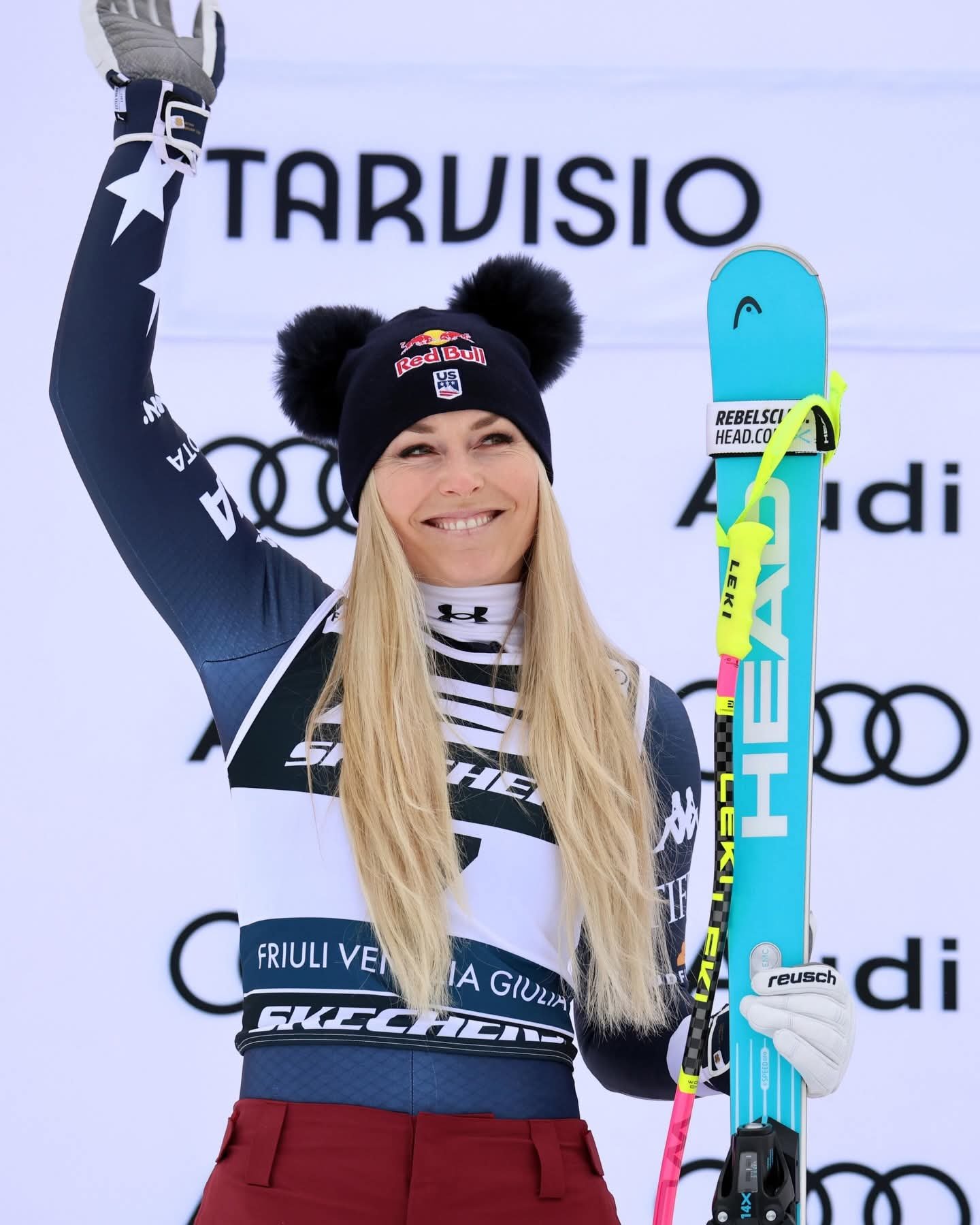 린지 본이 최근 이탈리아 타르비시오에서 열린 FIS 알파인 월드컵 경기를 마친 뒤 환호하는 팬들에게 활짝 웃으며 인사하고 있다. 사진출처|린지 본 페이스북