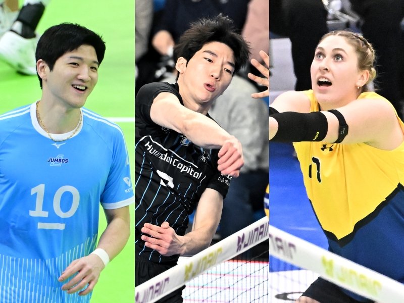 V리그 정규리그가 올스타전 휴식기로 잠시 숨을 고르고 있는 가운데, 후반기 순위 싸움의 관건은 주축들의 컨디션이다. 대한항공 정지석, 현대캐피탈 허수봉, 현대건설 카리 가이스버거(왼쪽부터). 사진제공|KOVO