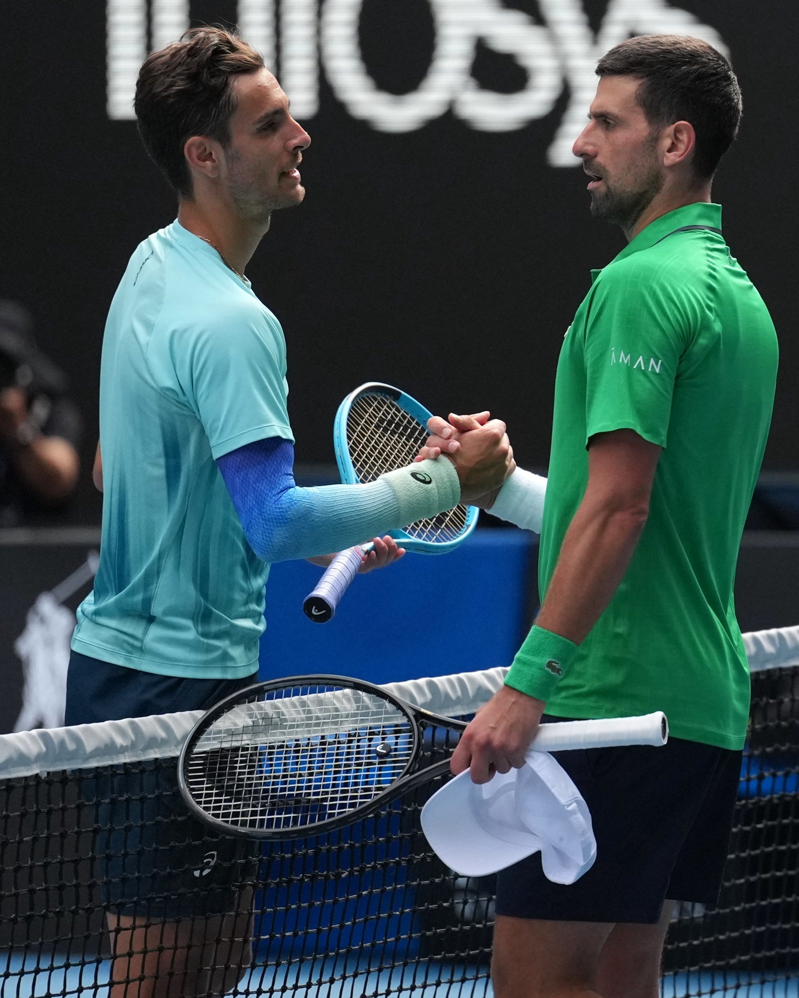 노박 조코비치(오른쪽)가 28일(한국시간) 호주 멜버른에서 열린 2026 호주오픈 테니스 대회 남자 단식 8강전에서 로렌초 무세티를 상대로 기권승을 거둔 뒤 무세티와 인사를 나누고 있다. 멜버른|AP뉴시스